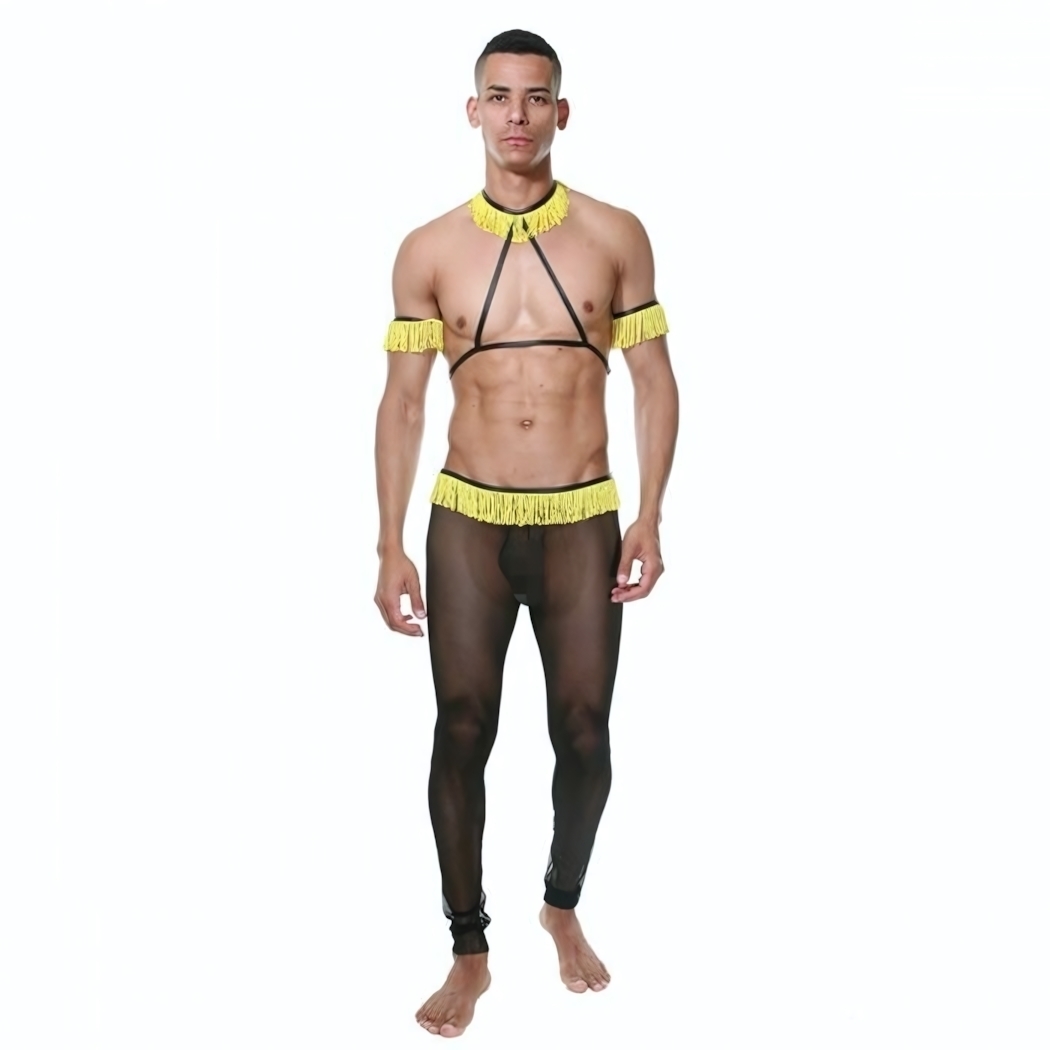 Эротичный мужской костюм для смелых экспериментов, сочетающий дерзкий дизайн и комфортную посадку. Черная полупрозрачная ткань с желтой бахромой подчеркнет вашу физическую форму, создавая эффектный акцент на плечах и груди.