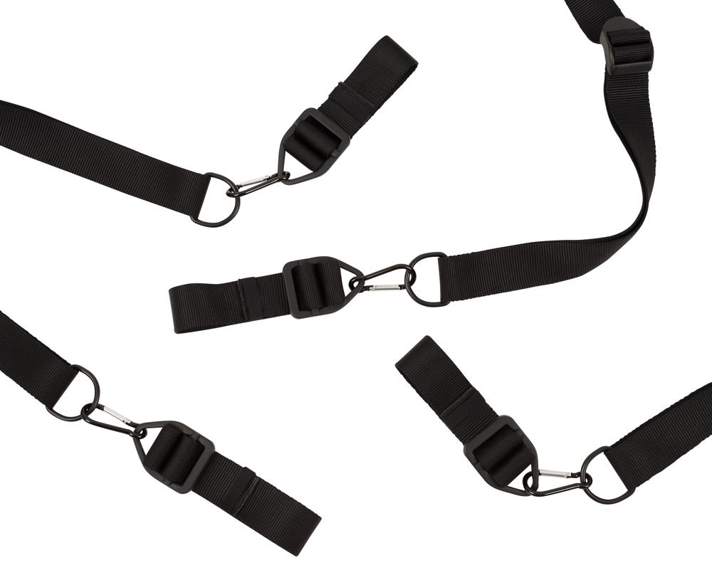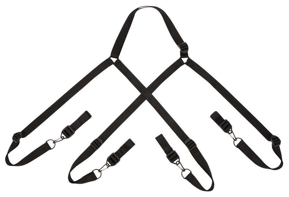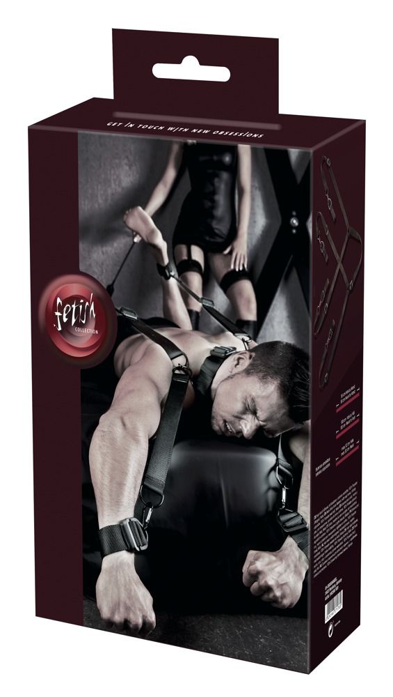 Система включает ошейник и четыре прочных ремня с фиксаторами для запястий и лодыжек. Все элементы соединяются между собой с помощью металлических карабинов, что позволяет быстро собрать конструкцию и при необходимости изменить положение фиксации. Регулируемая длина ремней обеспечивает комфортную посадку и адаптацию под индивидуальные параметры пользователя.