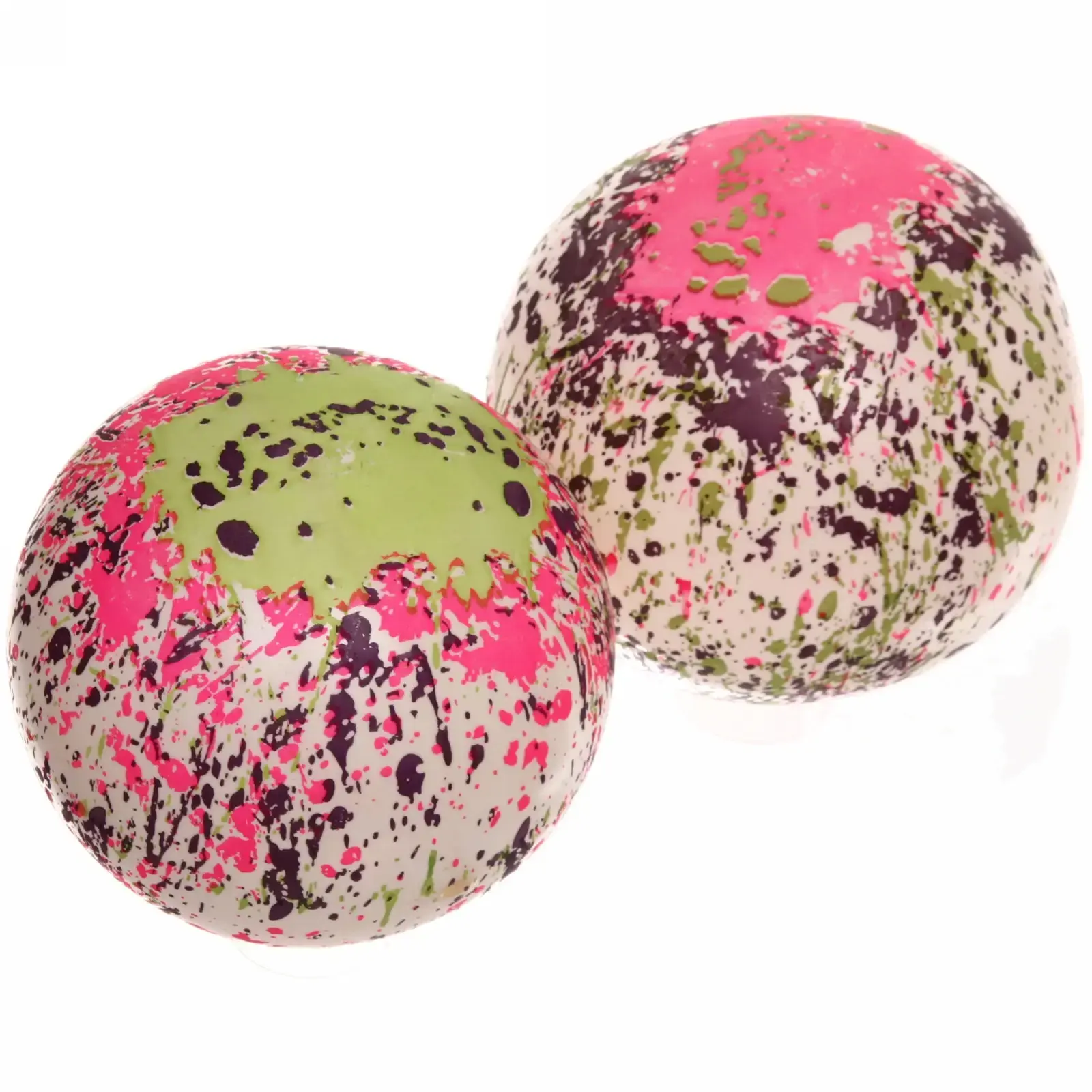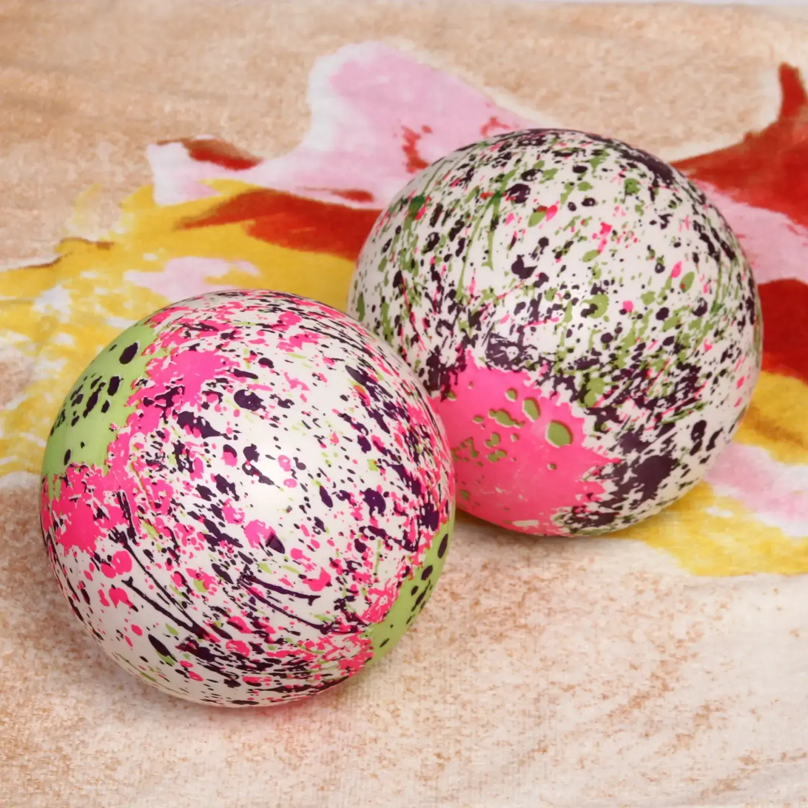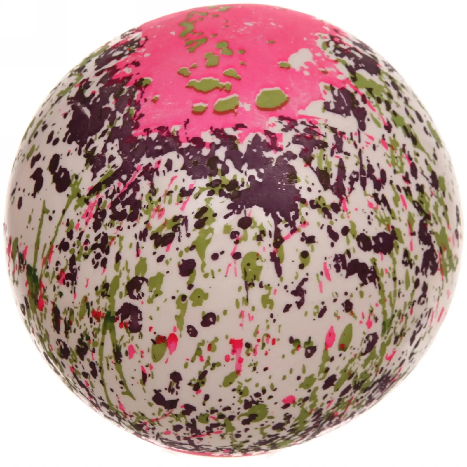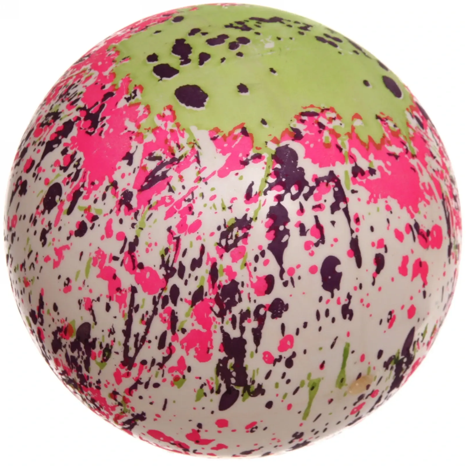 Каждый мяч украшен уникальным рисунком, напоминающим акварельные брызги. Цветовая гамма включает яркие оттенки: розовый, зелёный, фиолетовый и другие. Отгружается один мяч, цвет определяется случайным образом.