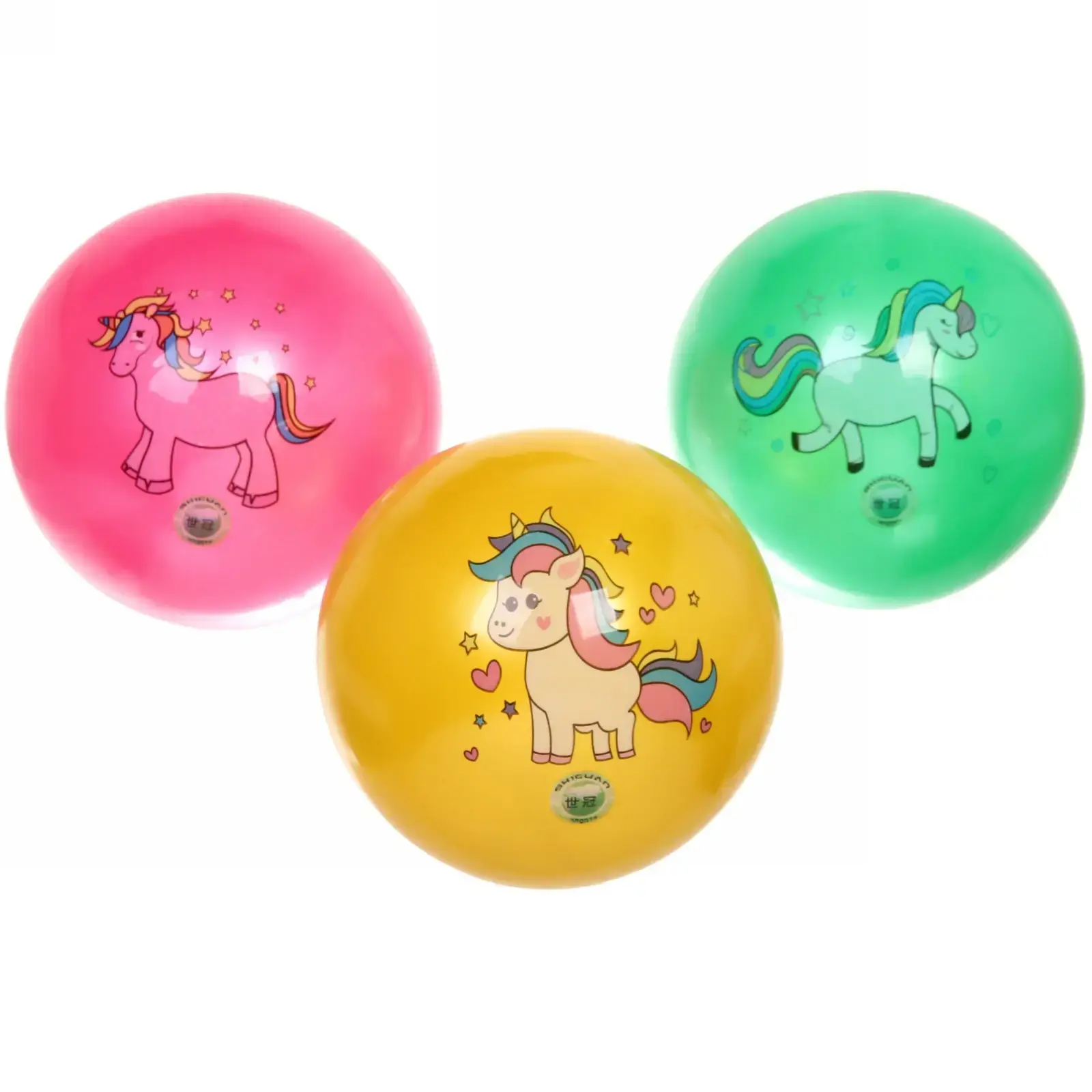 Мяч представлен в трех вариантах расцветки: розовый с звездами, желтый с сердечками и зеленый с причудливой прической единорога. Цвет определяется случайным образом при отгрузке.