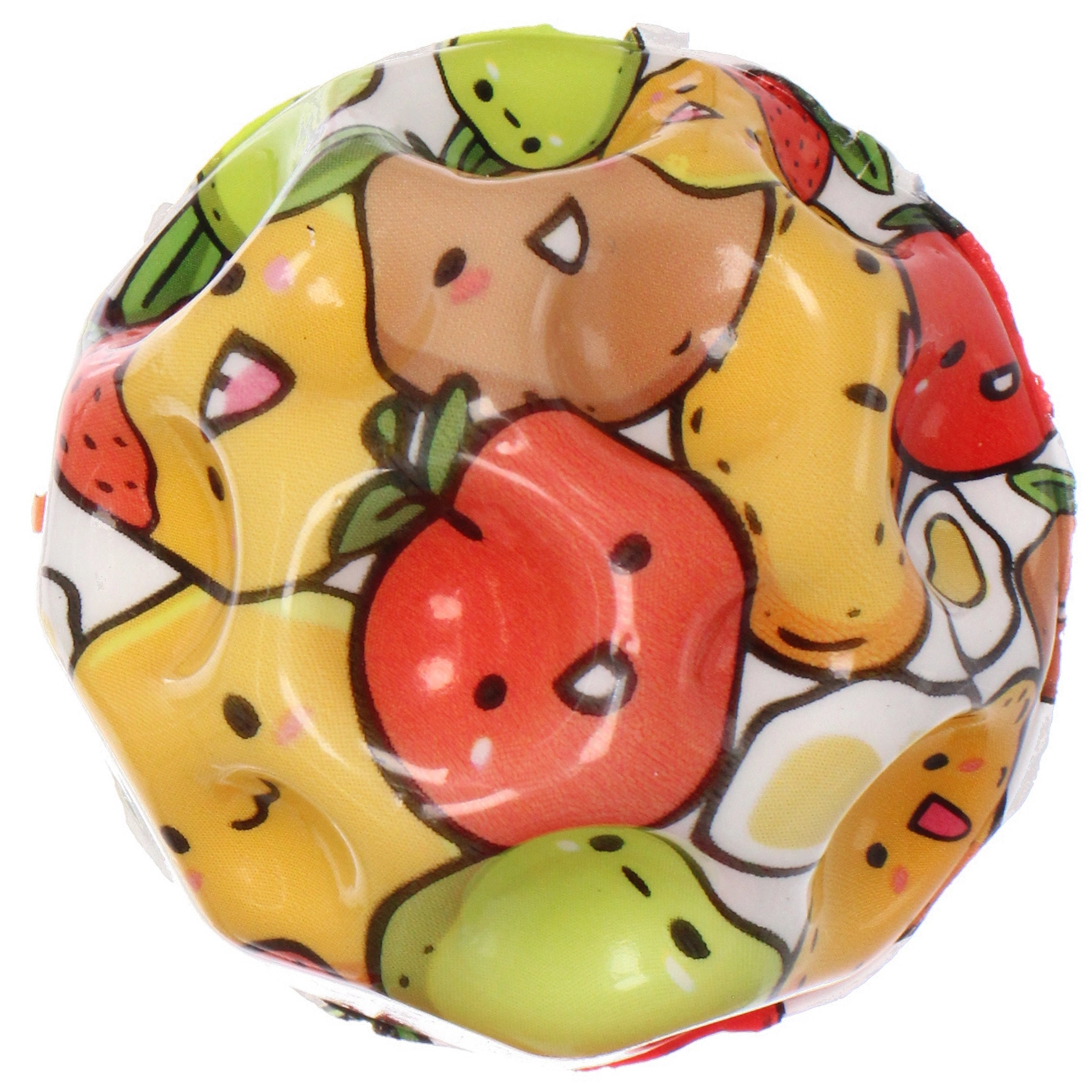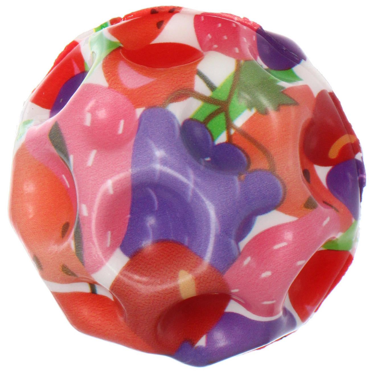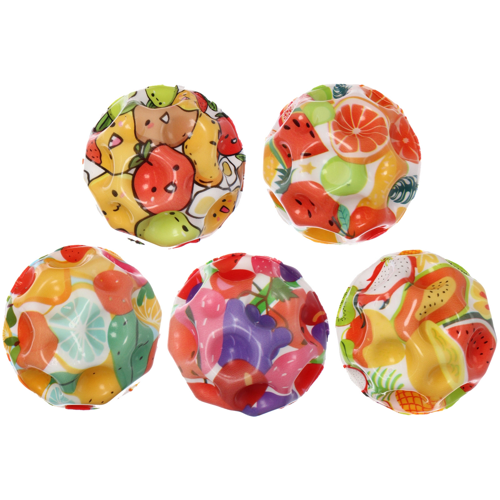 Этот компактный и прыгучий мяч станет любимым спутником как для детей, так и для взрослых. Благодаря уникальной бугристой поверхности, он не только отлично пружинит от любых покрытий, но и обеспечивает приятный массажный эффект для ладоней. Прозрачная внешняя оболочка скрывает под собой сочные и аппетитные рисунки фруктов, ягод и сладостей с забавными мультяшными лицами, которые мгновенно привлекают внимание и вызывают положительные эмоции.