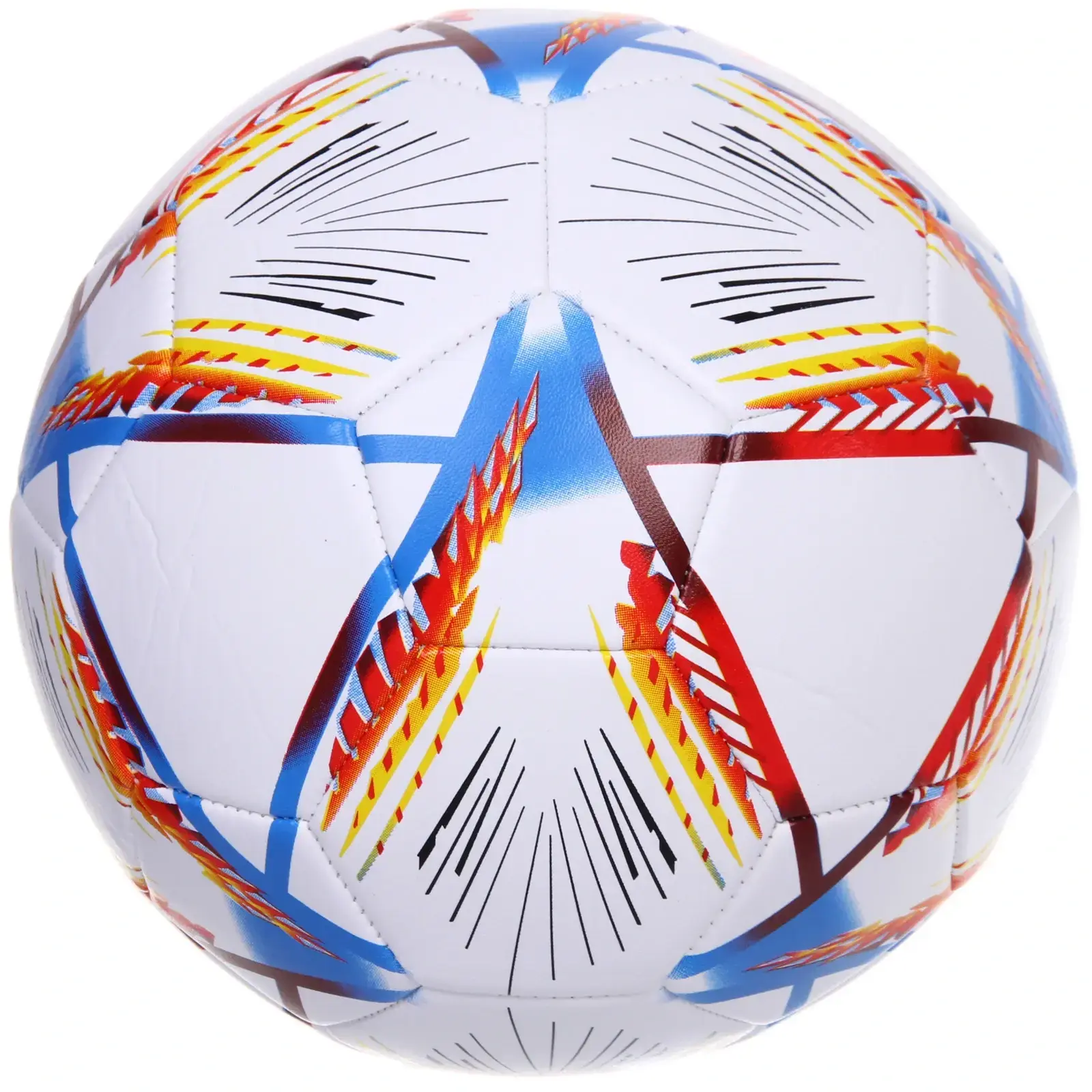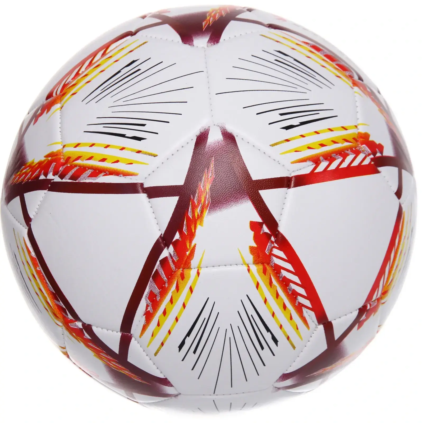 Мяч имеет стандартную круглую форму и выполнен в белом цвете с красными, желтыми и синими узорами, что придает ему динамичный вид. Его конструкция состоит из нескольких сшитых панелей, что обеспечивает отличные игровые характеристики. Размер мяча соответствует стандартам, что делает его идеальным для футбольных матчей и тренировок.