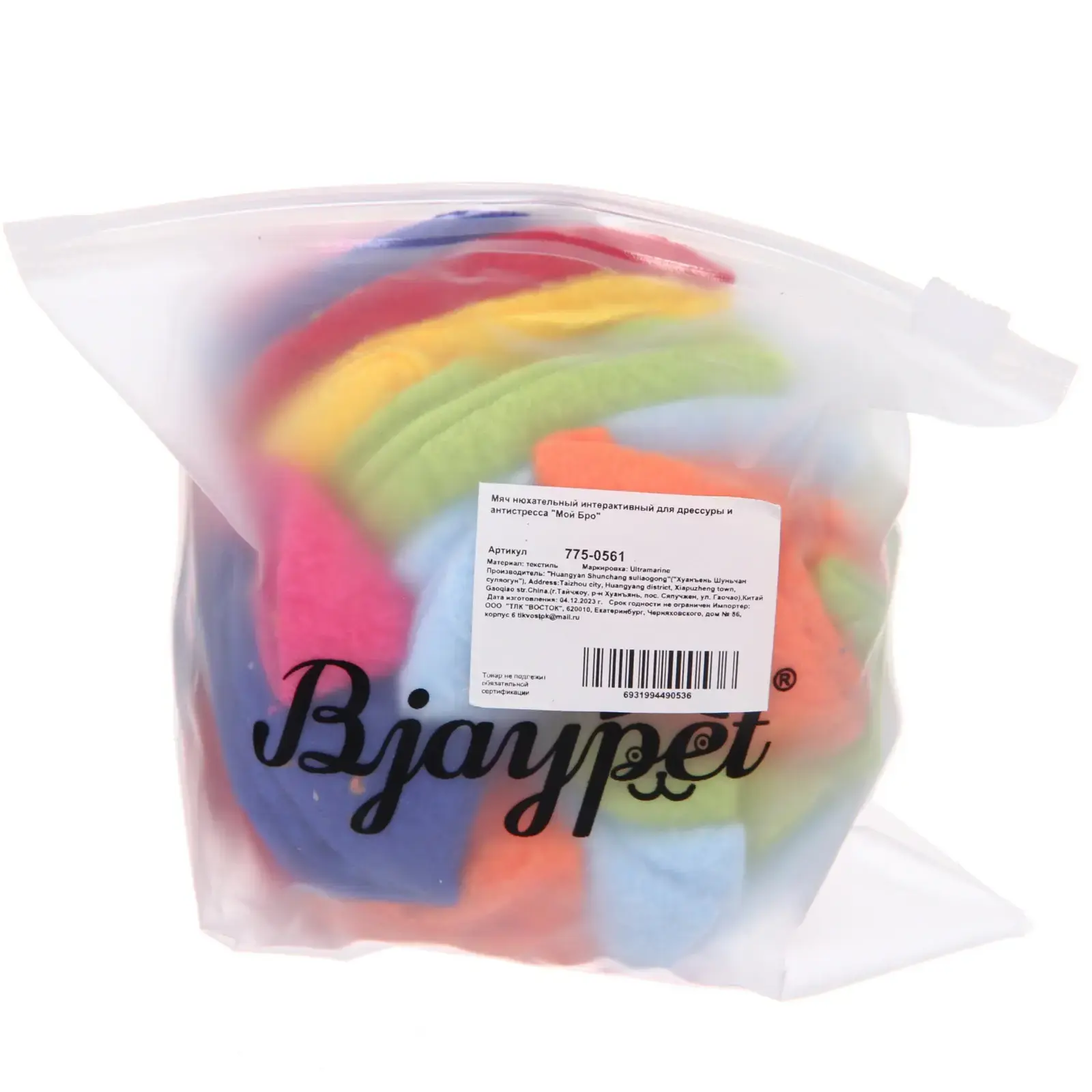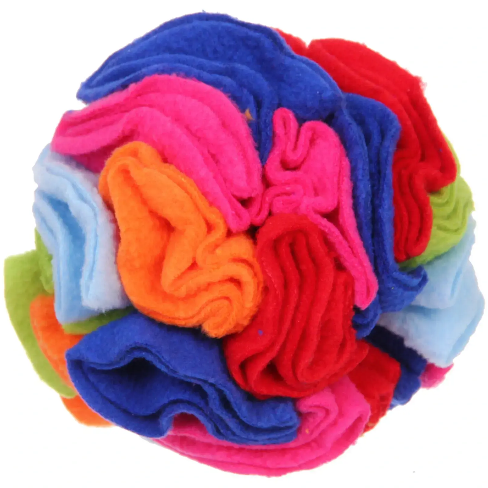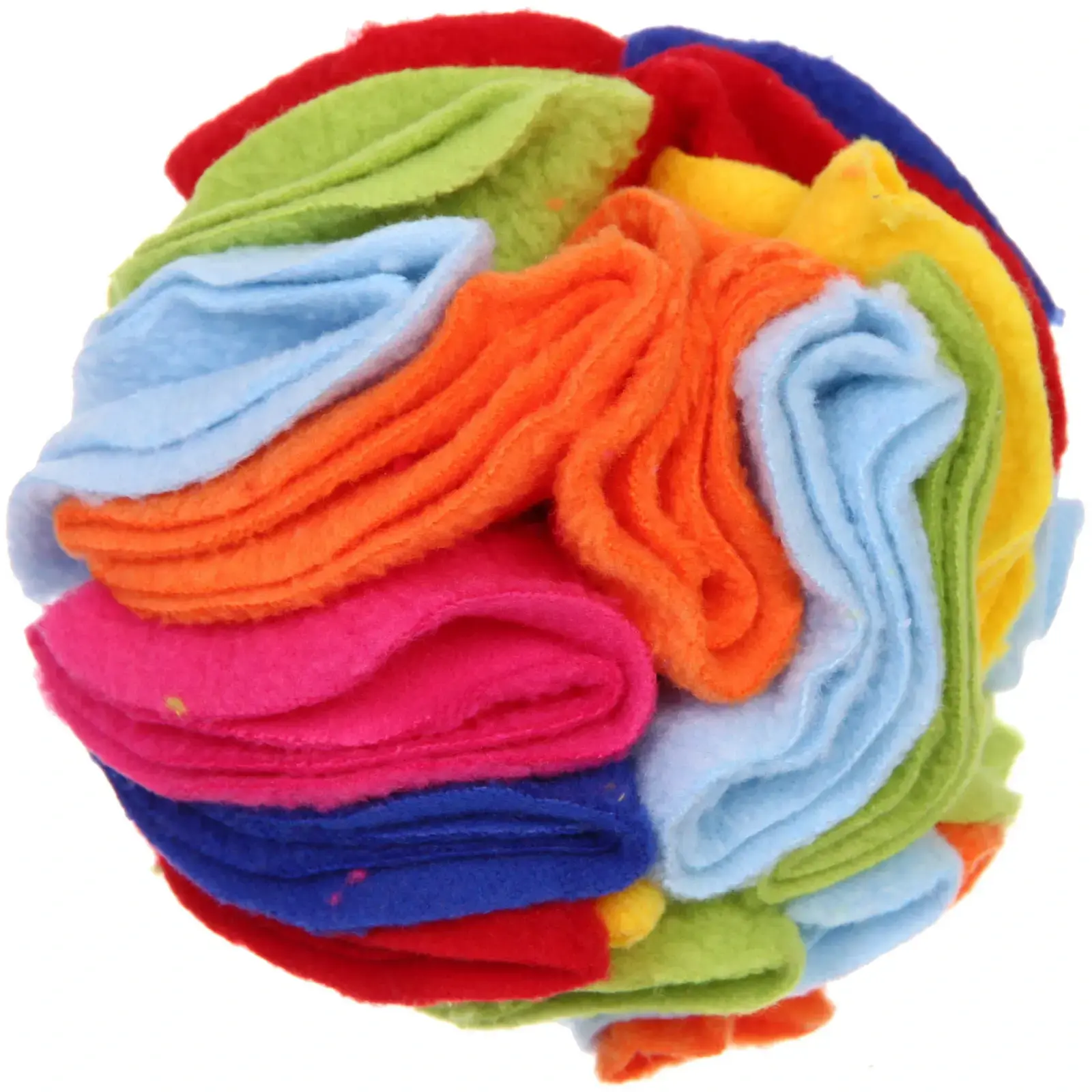 Благодаря мягким текстильным слоям мяч безопасен для зубов и десен. Его яркие цвета привлекают внимание, а уникальная конструкция из скрученных полосок ткани создает множество кармашков для лакомств. Размер мяча (диаметр 10 см) удобен для игр как с маленькими, так и с крупными породами животных.
