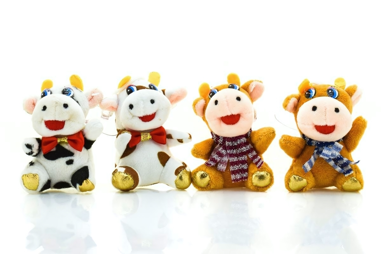 Каждая коровка имеет уникальный характер: оранжевая модель с полосатым шарфом создает летнее настроение, белоснежная с алыми акцентами — праздничный образ. Детали в виде вышитой улыбки и объемных ушей развивают тактильное восприятие у детей.