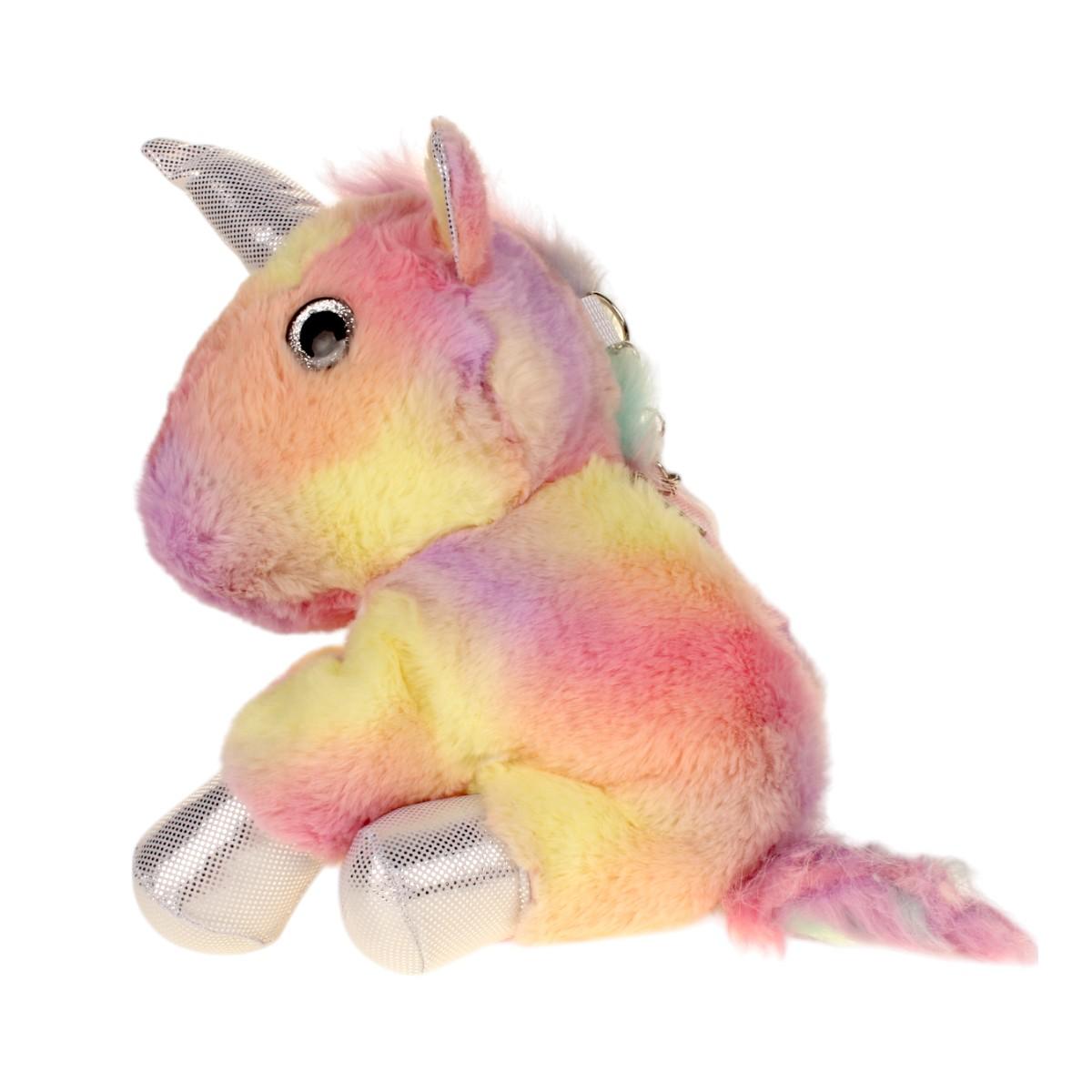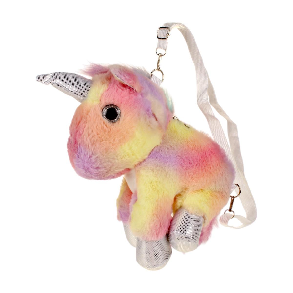 Размер игрушки составляет около 30 см, что идеально подходит для детских рук. Материалы, из которых изготовлен рюкзак, мягкие и безопасные для детей. Радужная окраска и блестящие детали делают его привлекательным и стильным. Этот рюкзак станет не только игрушкой, но и оригинальным элементом декора в детской комнате.