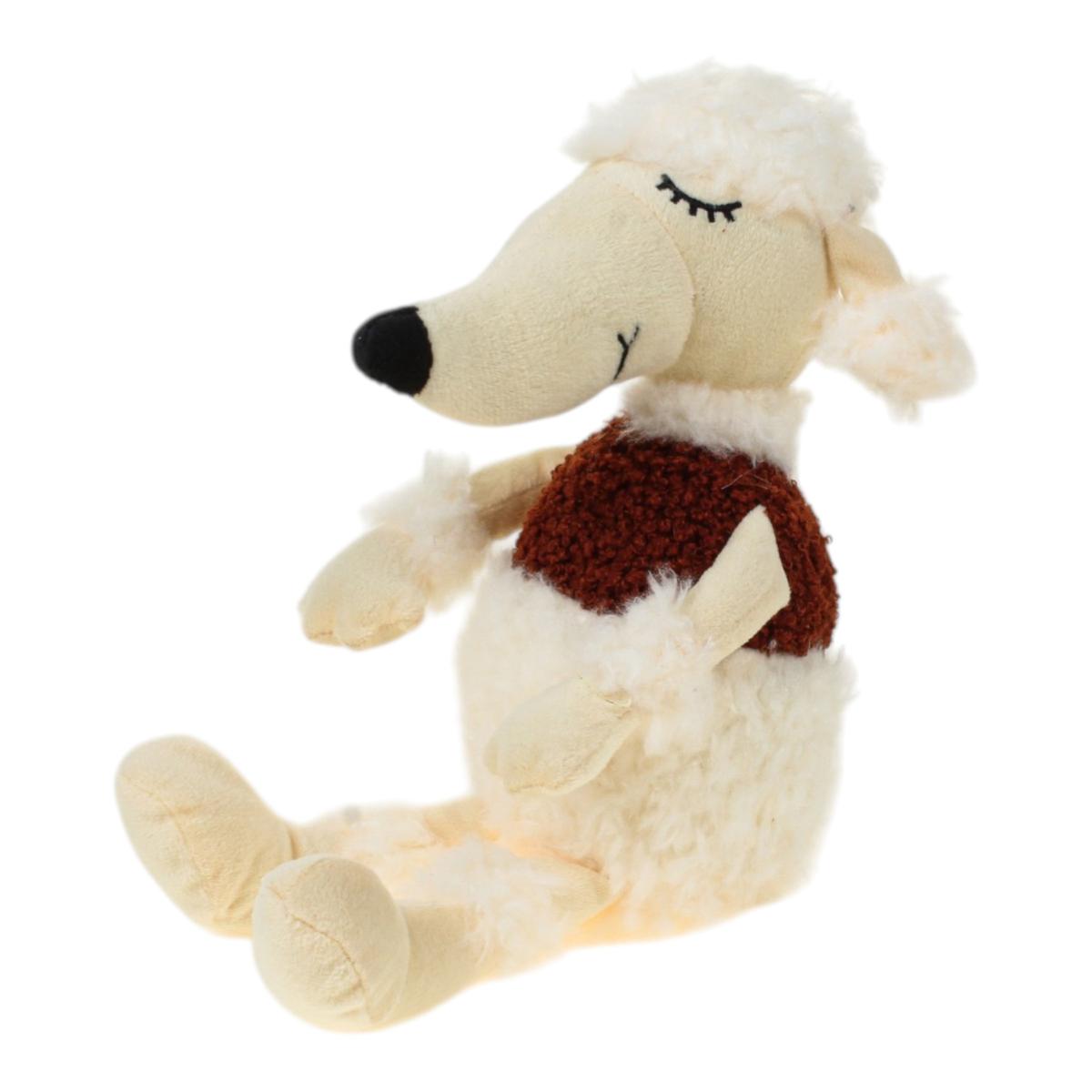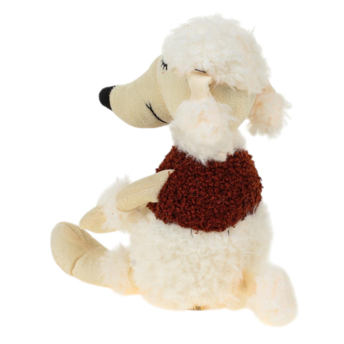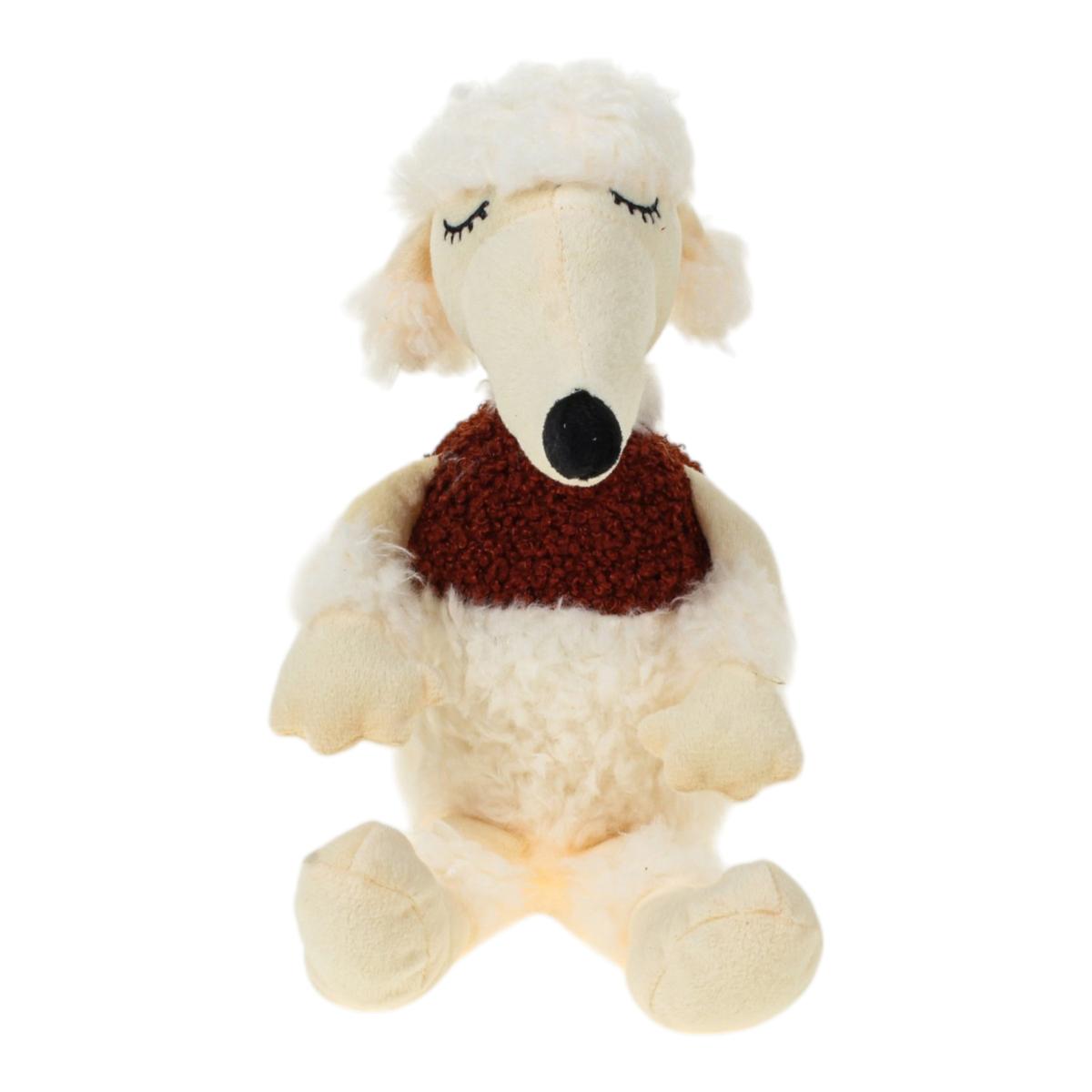 - Приятная текстура: Сочетание гладкого светло-бежевого материала и пушистого белого вьющегося ворса на голове, ушках и лапках радует разнообразием тактильных ощущений.