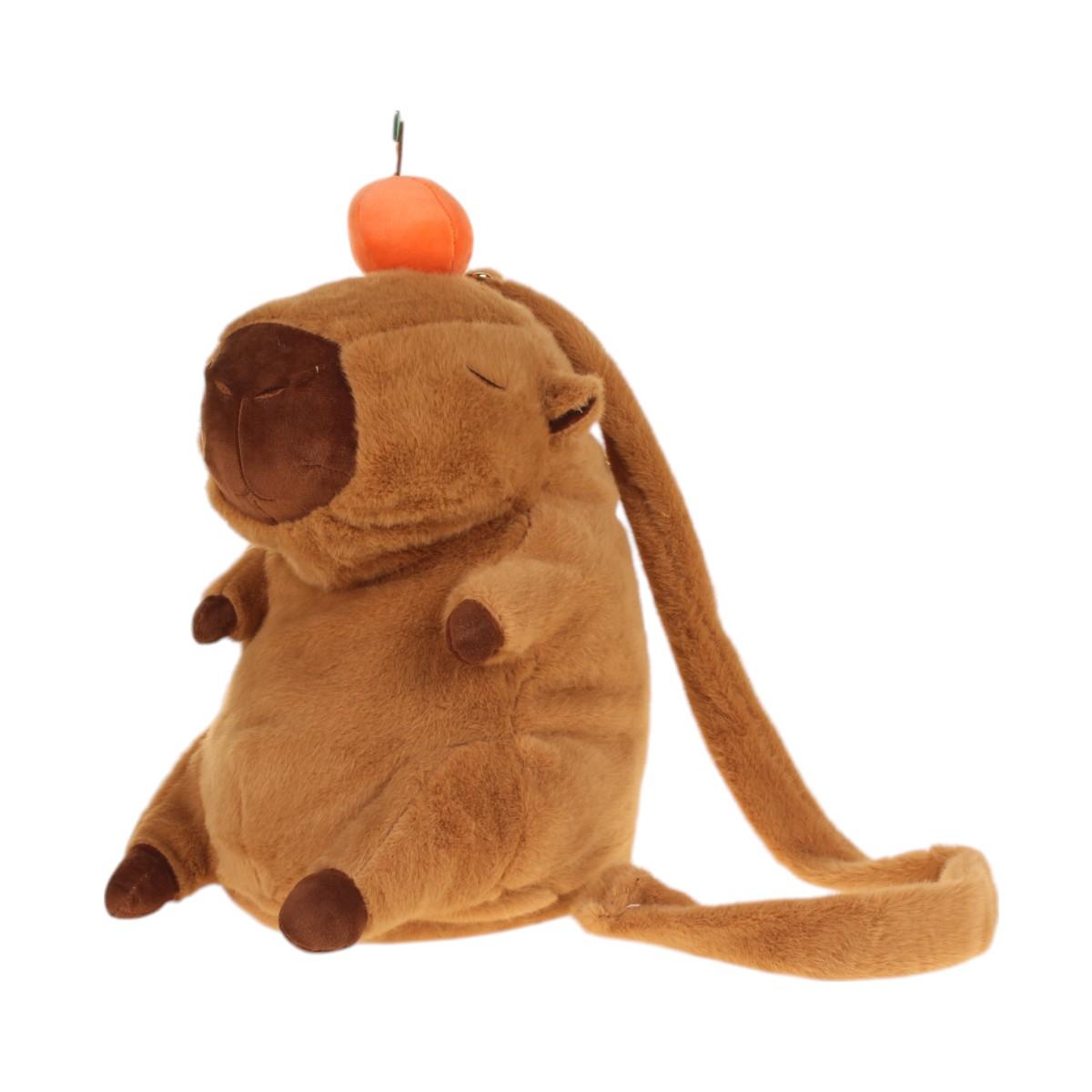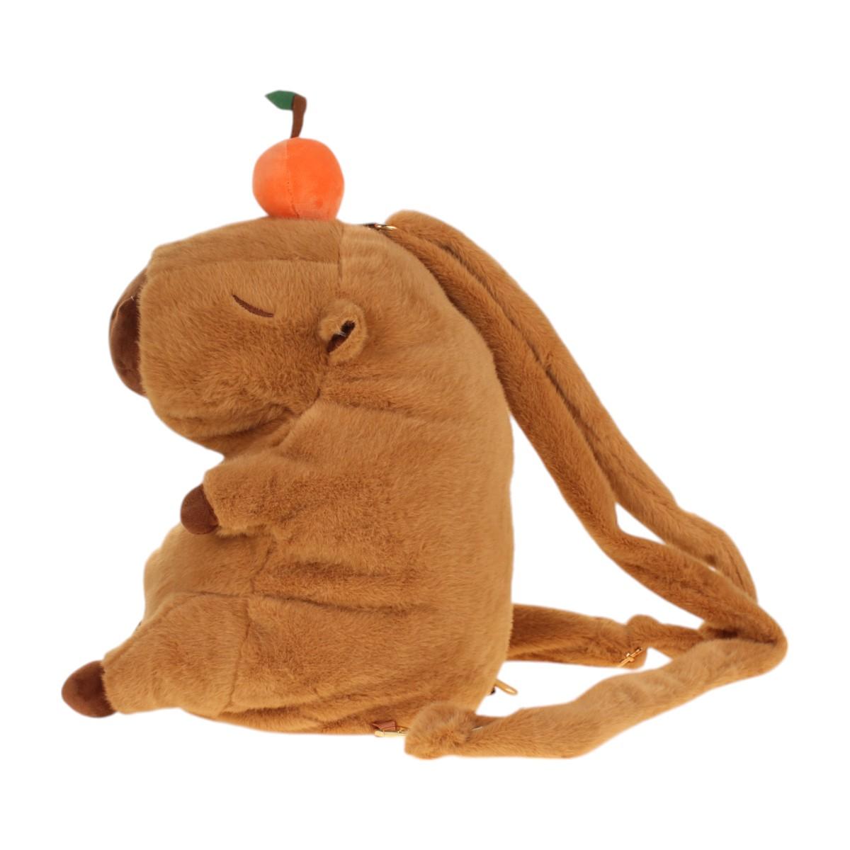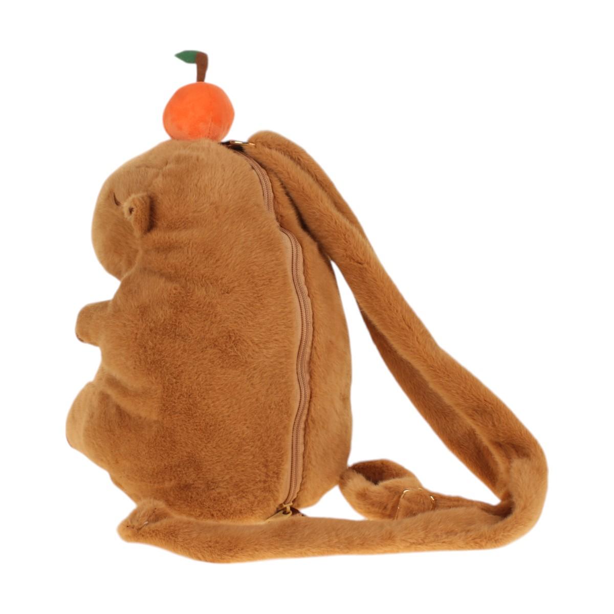 Коричневая основа с оранжевым декором в виде фрукта гармонично впишется в любой образ. Компактные размеры (ориентировочно 25х30 см) позволяют брать игрушку-рюкзак на прогулки, в поездки или использовать для хранения детских сокровищ. Основное отделение закрывается молнией — вещи всегда будут под надежной защитой.