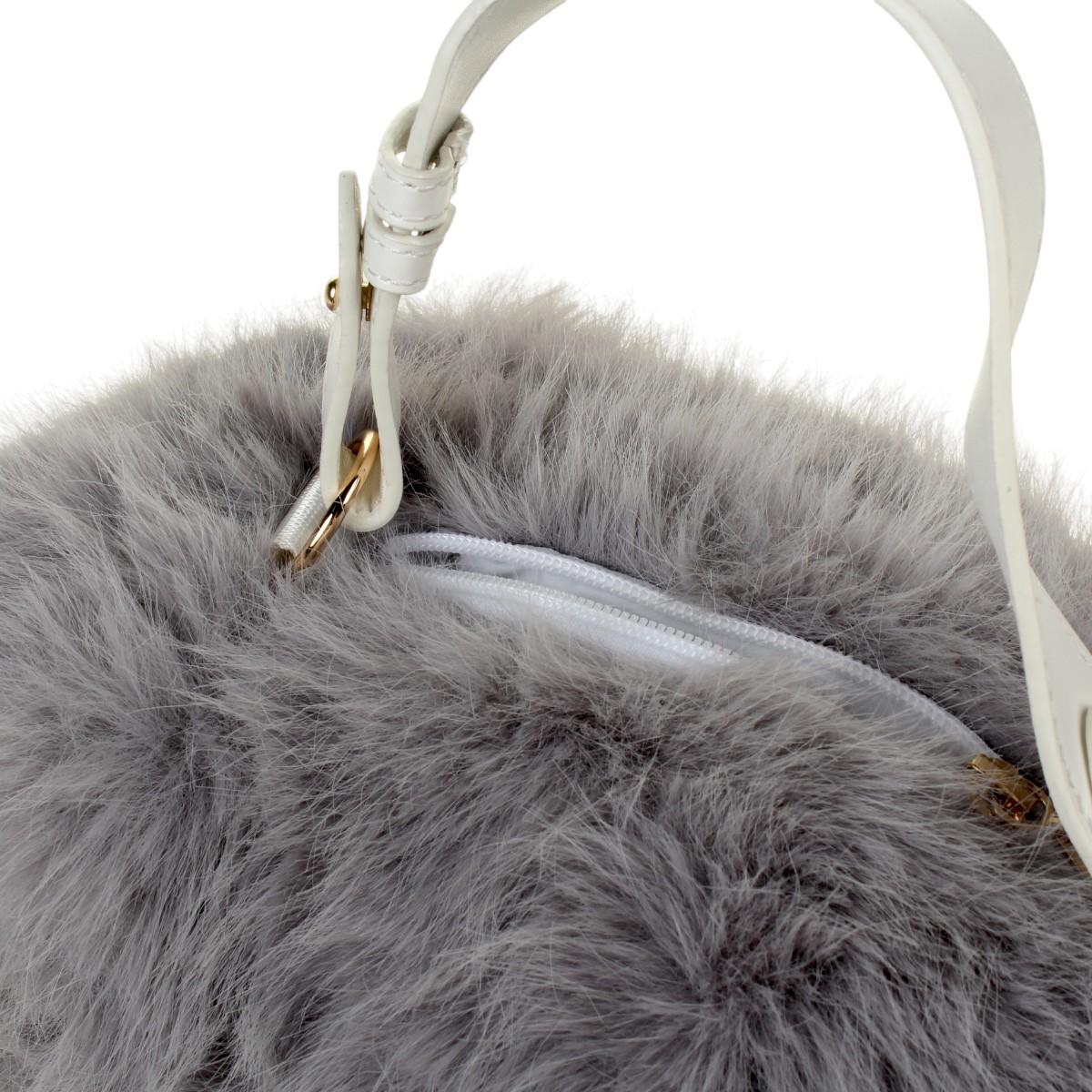Сумка выполнена из качественного искусственного меха серого цвета с белыми акцентами. Застежка-молния обеспечивает безопасное хранение ваших вещей. Регулируемая ручка из белого синтетического материала фиксируется металлическими пряжками.