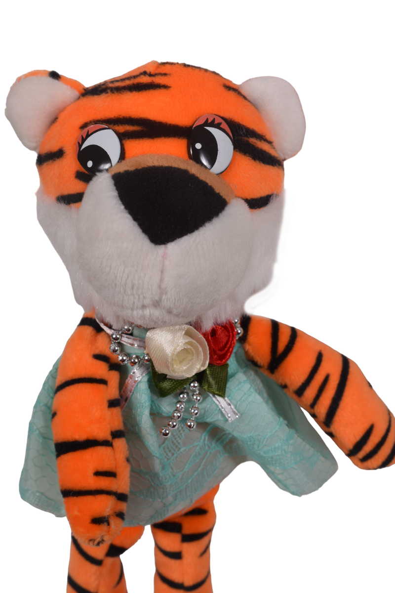 Почему стоит выбрать именно эту игрушку? Во-первых, она выполнена из мягкого текстиля, что обеспечивает комфорт и безопасность для детей. Во-вторых, яркий дизайн и детали, такие как светло-голубое платье с кружевом и украшения из искусственных цветов, делают ее уникальной. Тигр также имеет длинные, тонкие конечности, что придает ей дополнительный стиль и привлекательность.