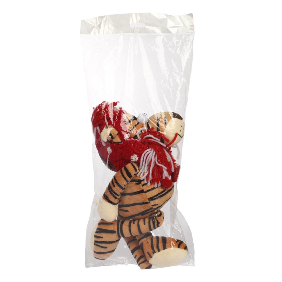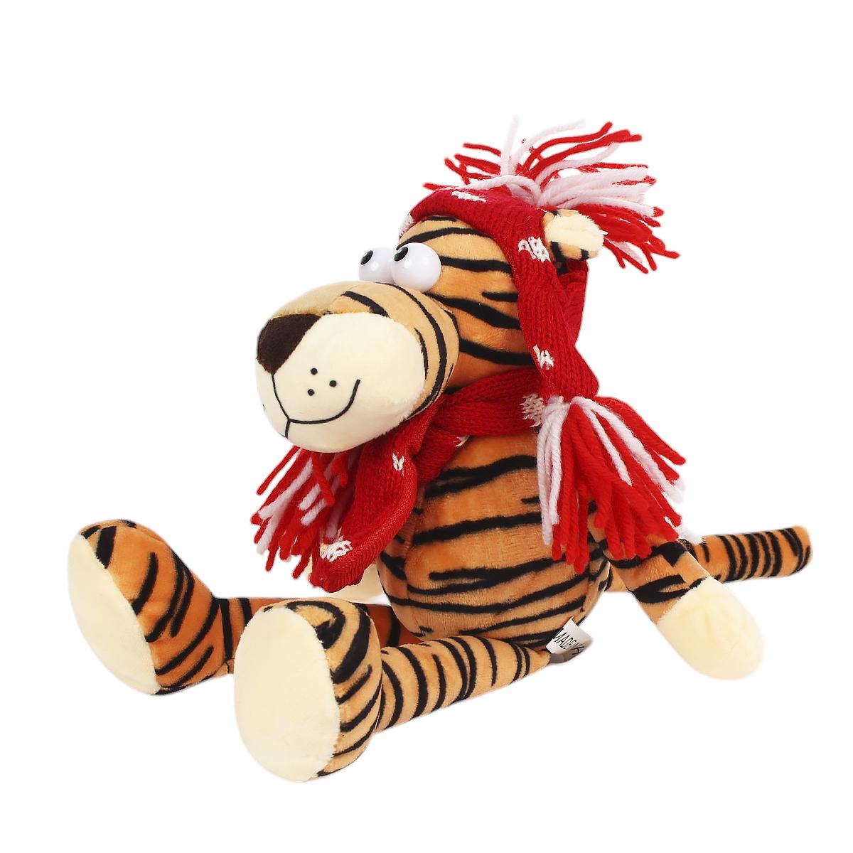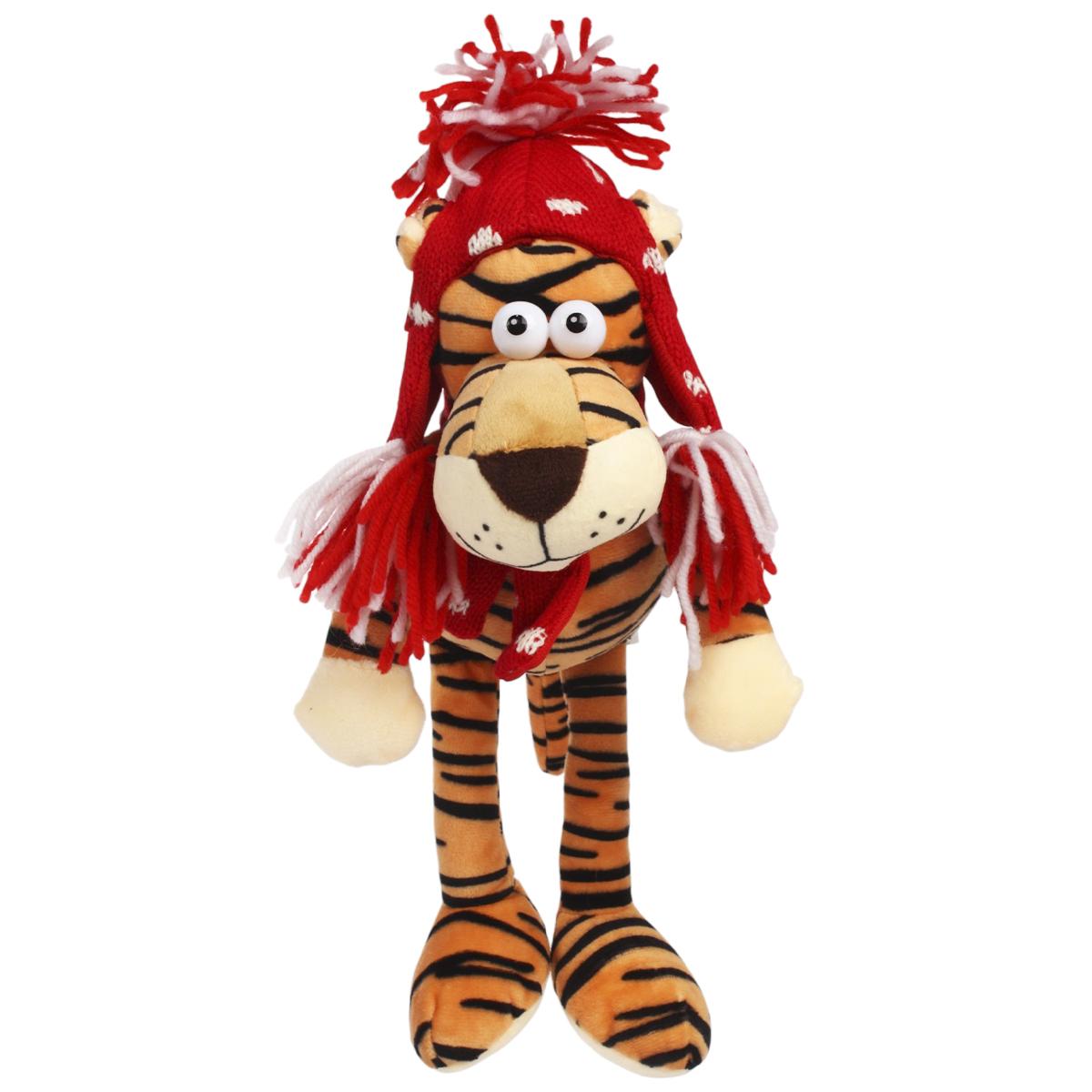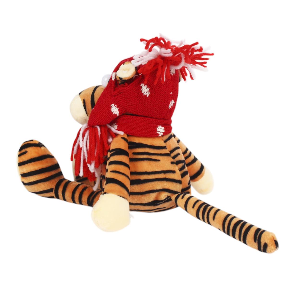 Размер игрушки составляет 25 см, что делает ее удобной для игры и хранения. Тигр имеет яркую полосатую окраску с преобладанием оранжевого и черного цветов, а также одет в красную шапку и шарф, что придает ему уникальный вид. Эта игрушка станет не только другом для вашего ребенка, но и стильным элементом интерьера.