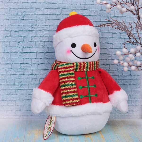 Снеговик имеет белое тело, красную шапку и куртку, а также цветной шарф с зелеными, красными и золотыми полосами. Его оранжевый нос в форме морковки и улыбающееся лицо делают его особенно привлекательным. Эта игрушка станет не только любимцем детей, но и украшением вашего дома.