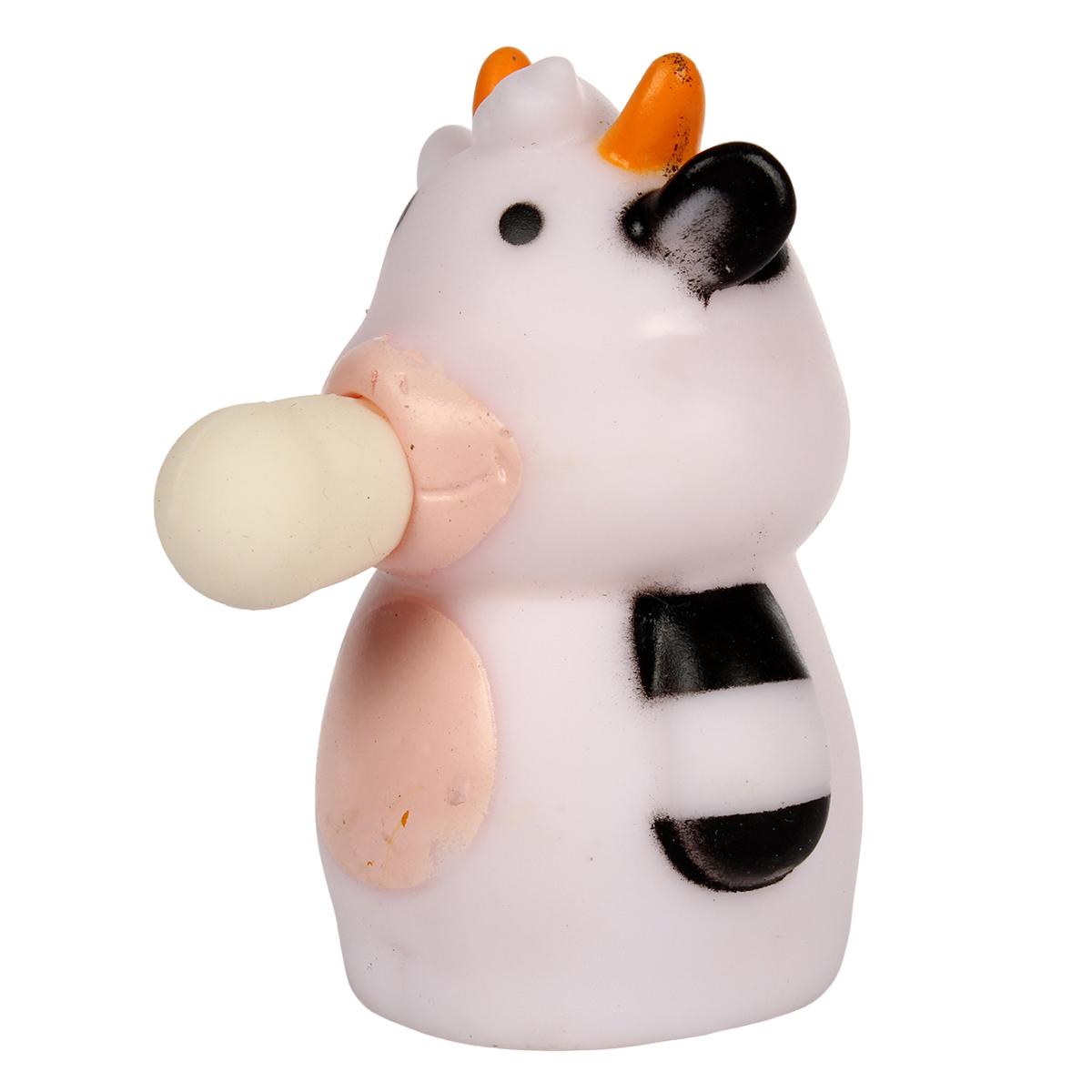 Размер упаковки составляет 10,0 * 5,0 * 9,0 см, что делает игрушку удобной для хранения и транспортировки. Основной цвет — белый, с черными и оранжевыми элементами, что добавляет яркости и привлекательности. Корова имеет оранжевые рога и улыбающееся лицо, а из ее рта виден белый шарик, что делает ее еще более интересной для детей.