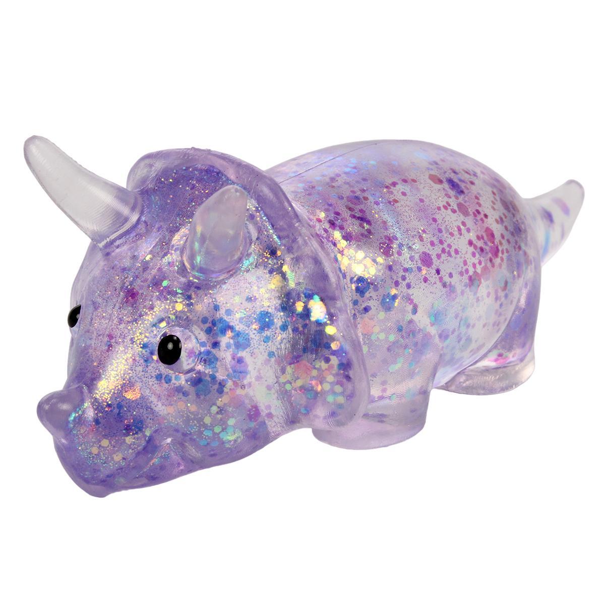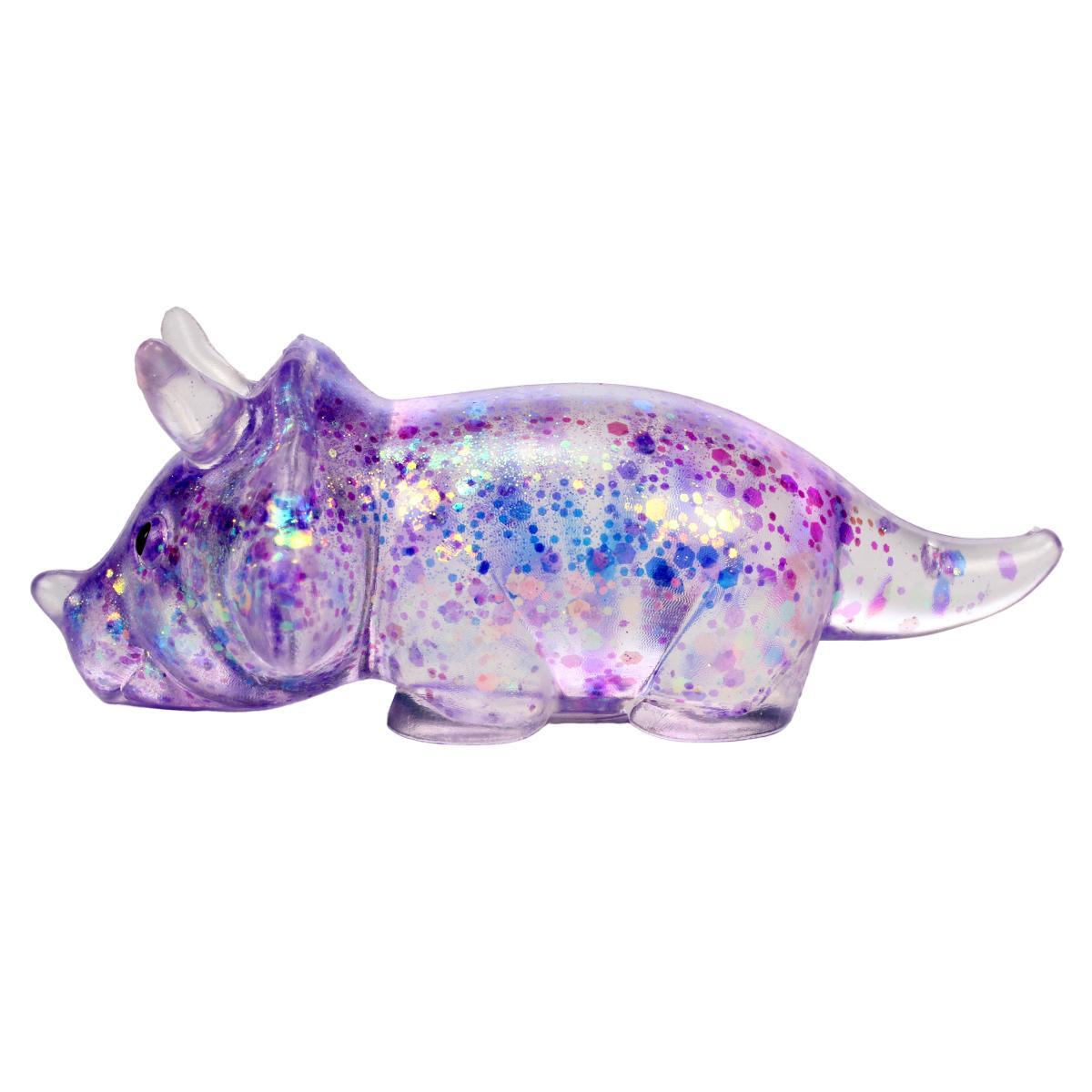 Игрушка выполнена в форме трицератопса с детализированными чертами: выпуклыми глазами, рельефным телом и текстурной поверхностью. Прозрачный корпус с разноцветными блестками мерцает при любом освещении, превращая антистресс в стильный аксессуар.