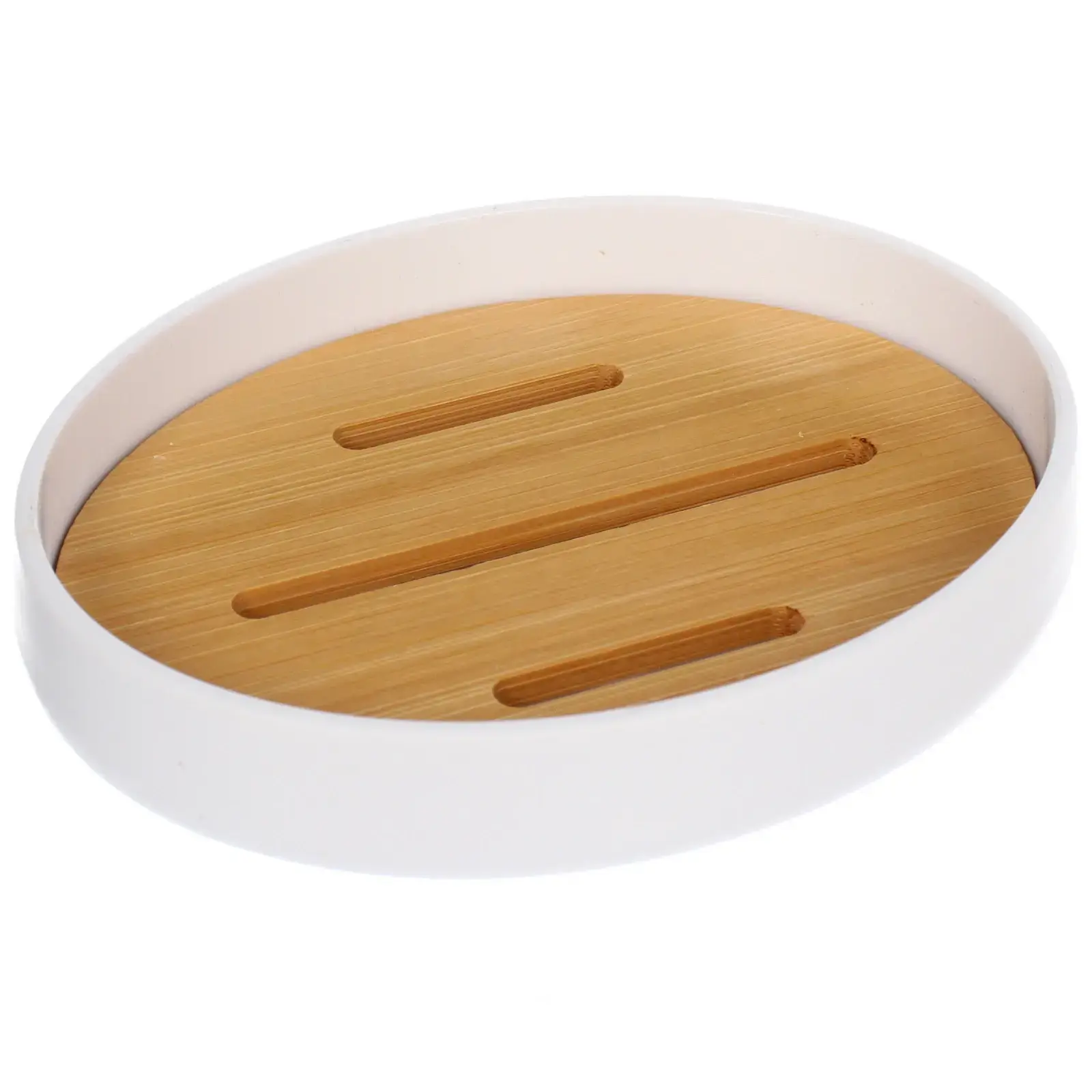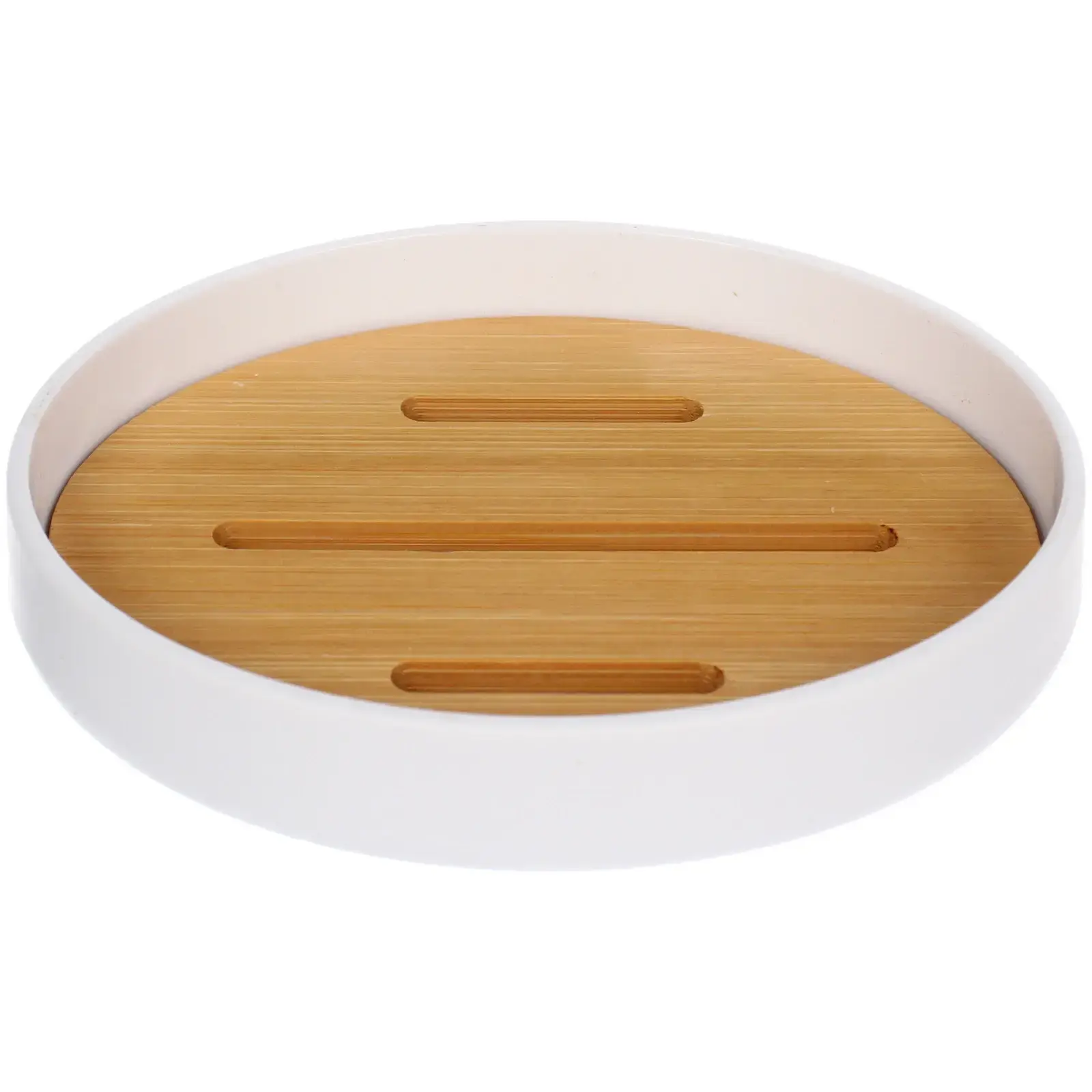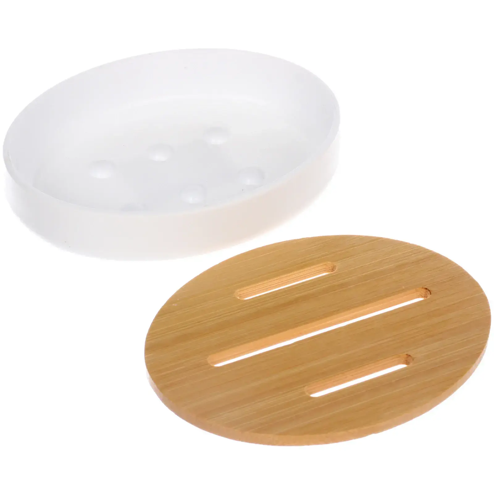 Мыльница имеет округлую форму и диаметр 12 см, что делает ее удобной для использования. Верхняя часть выполнена из бамбука с тремя продольными бороздками, а нижняя часть — из гладкого белого пластика. Это сочетание материалов обеспечивает долговечность и стильный внешний вид.