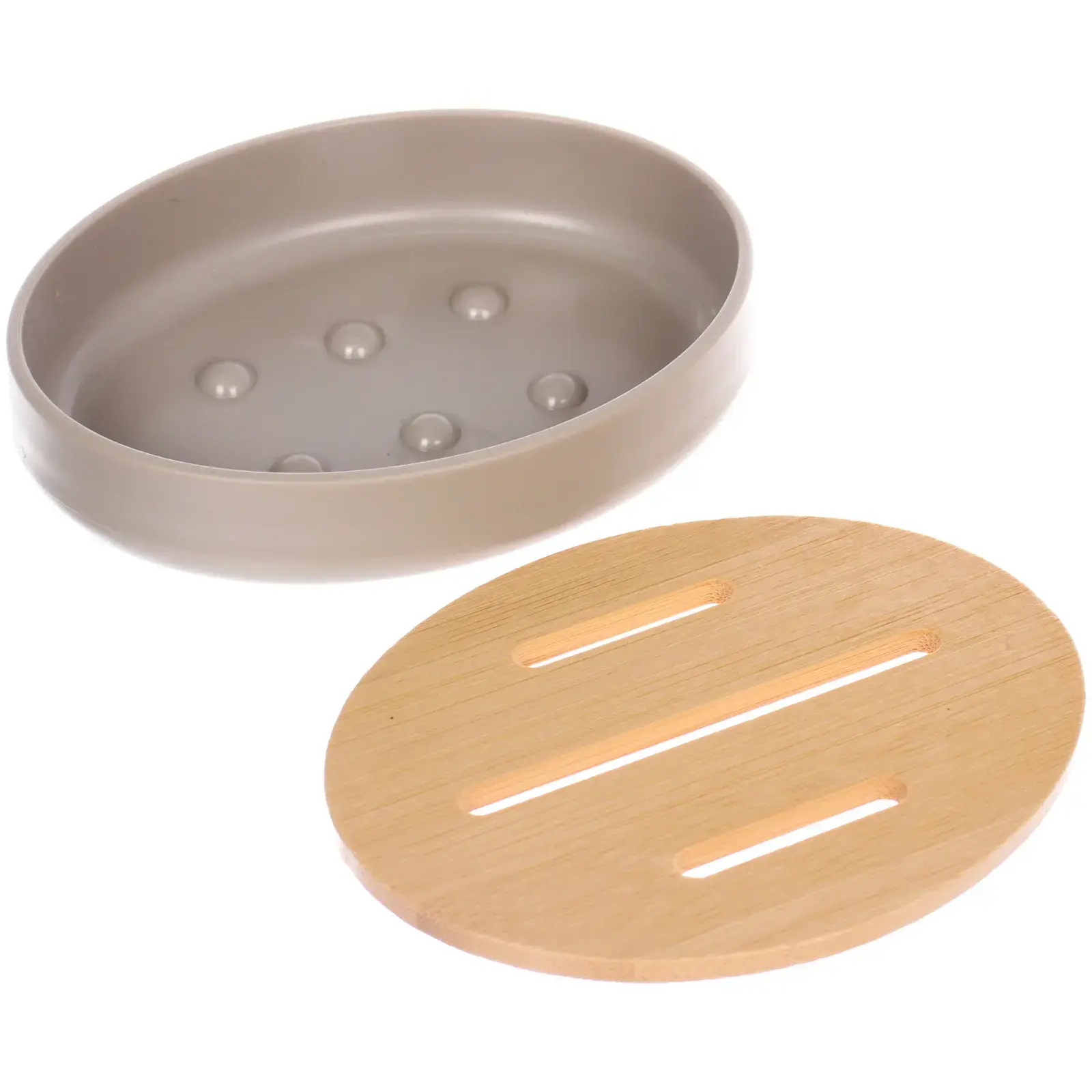 Мыльница изготовлена из высококачественных материалов: прочного пластика и натурального бамбука. Её размеры позволяют разместить стандартное твердое мыло или небольшие косметические принадлежности.