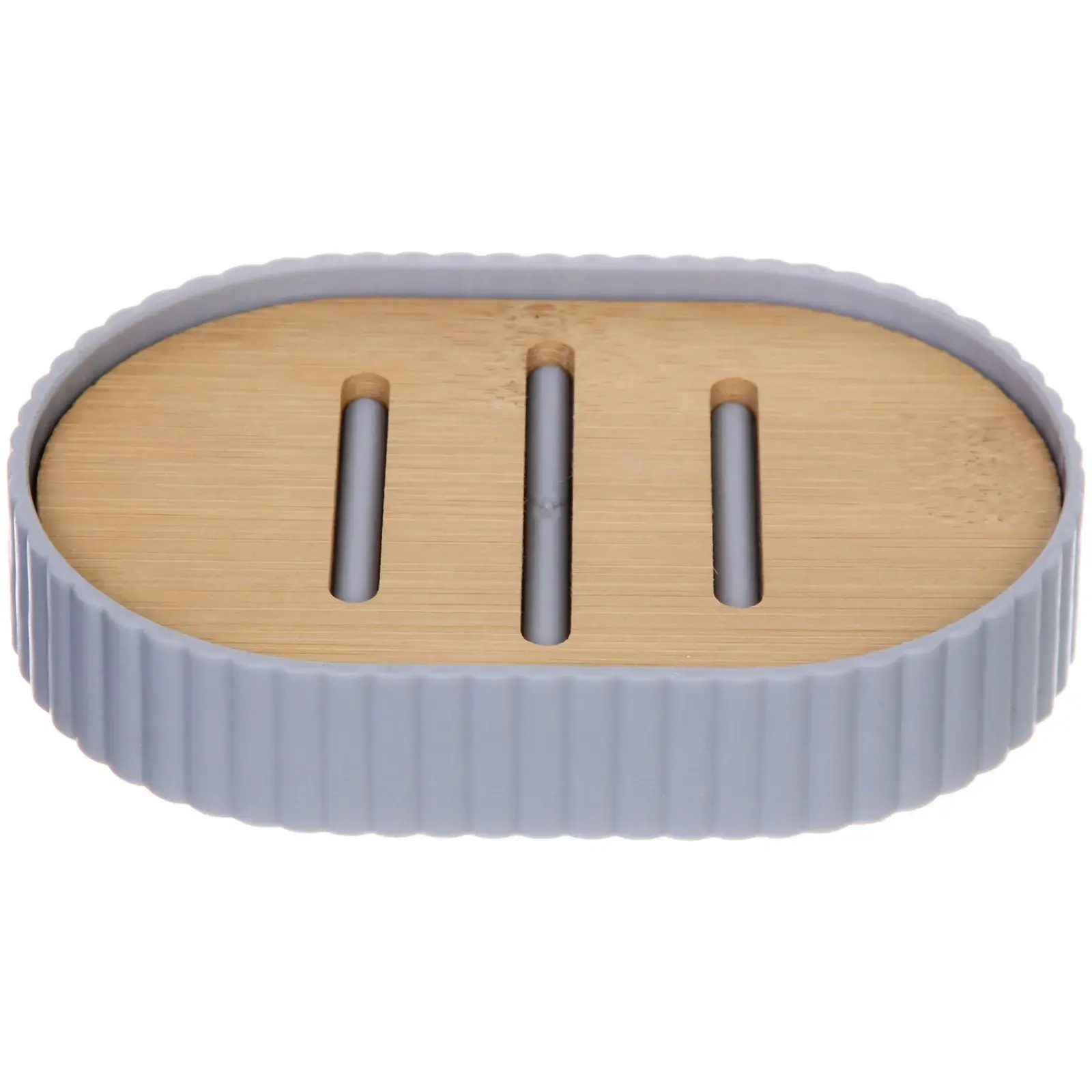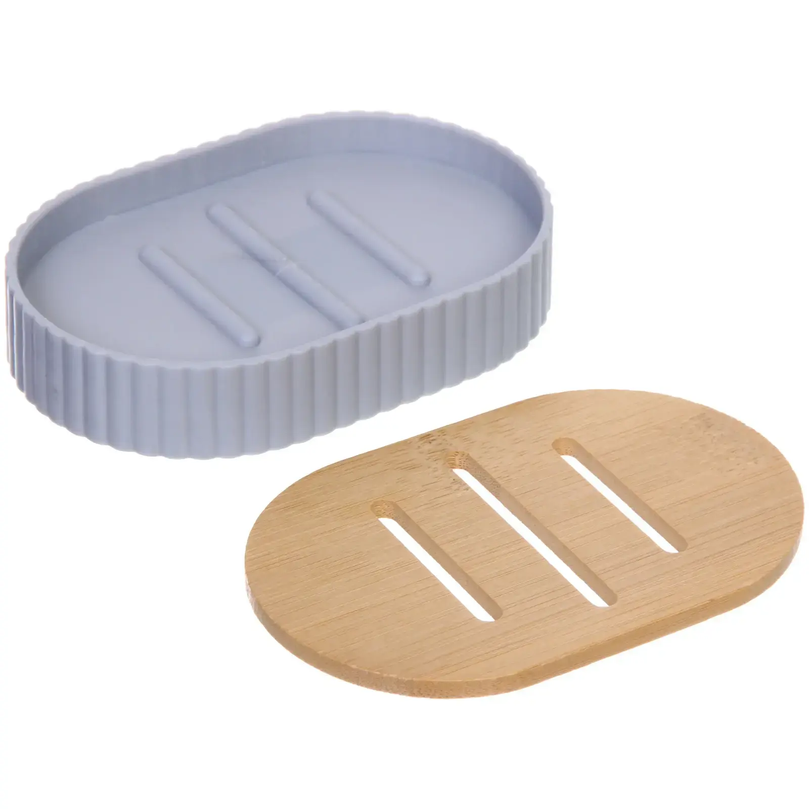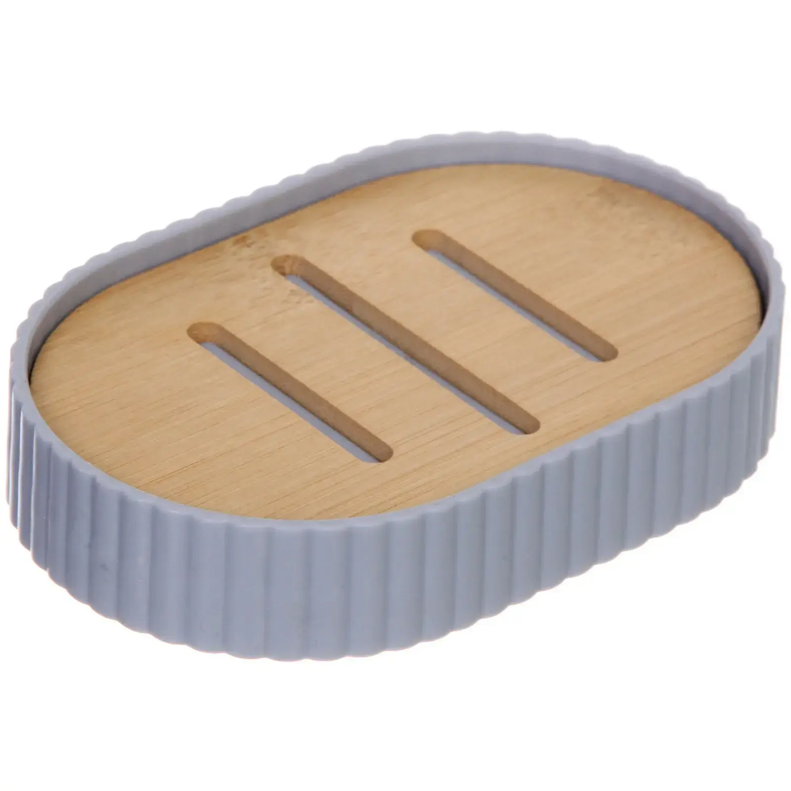Мыльница имеет компактные размеры, что позволяет удобно размещать её на столе или раковине. Верхняя часть выполнена из бамбука, а нижняя рамка — из серого пластика, что обеспечивает надежность и долговечность. Три продольные прорези на деревянной поверхности способствуют стоку воды, что делает использование мыльницы максимально комфортным.