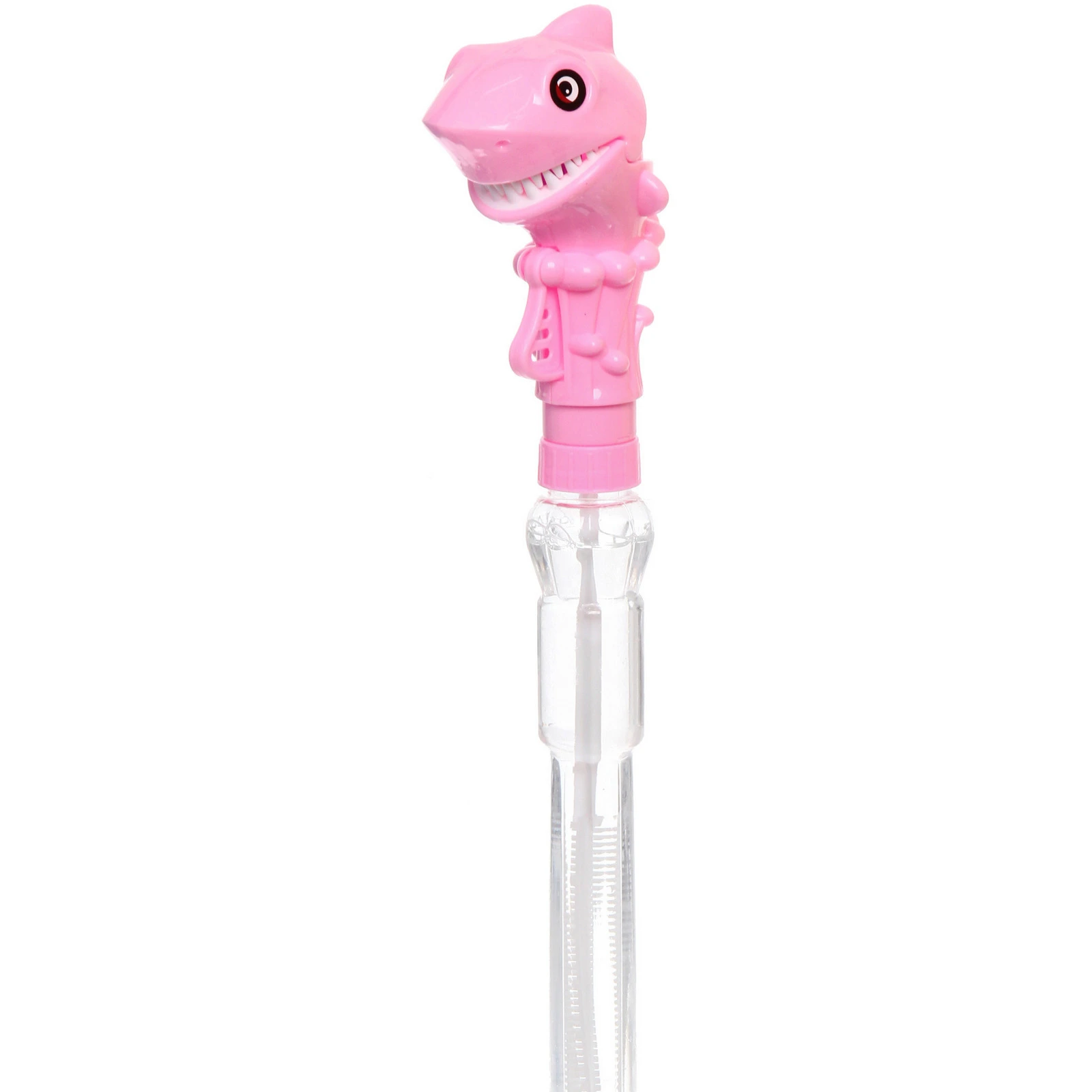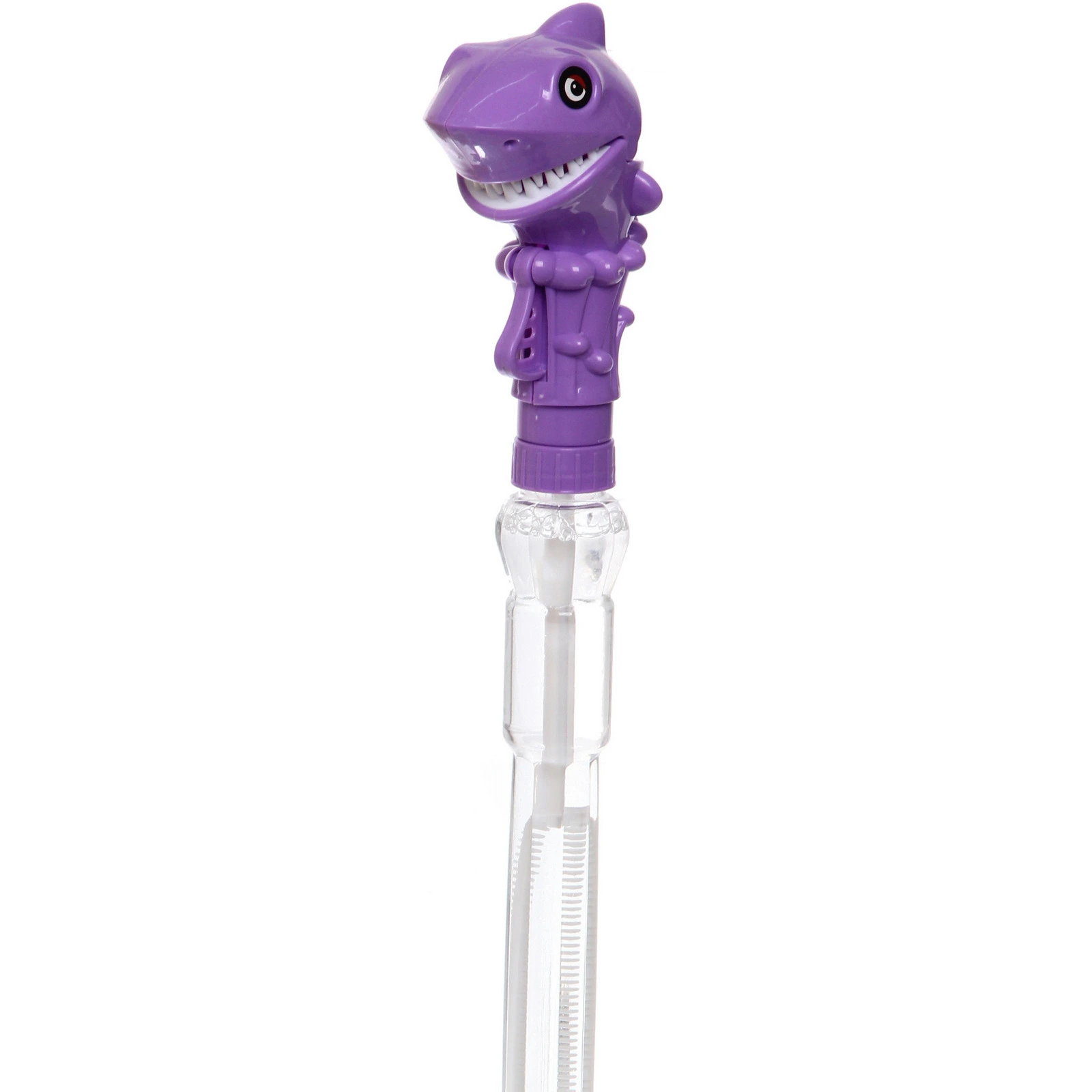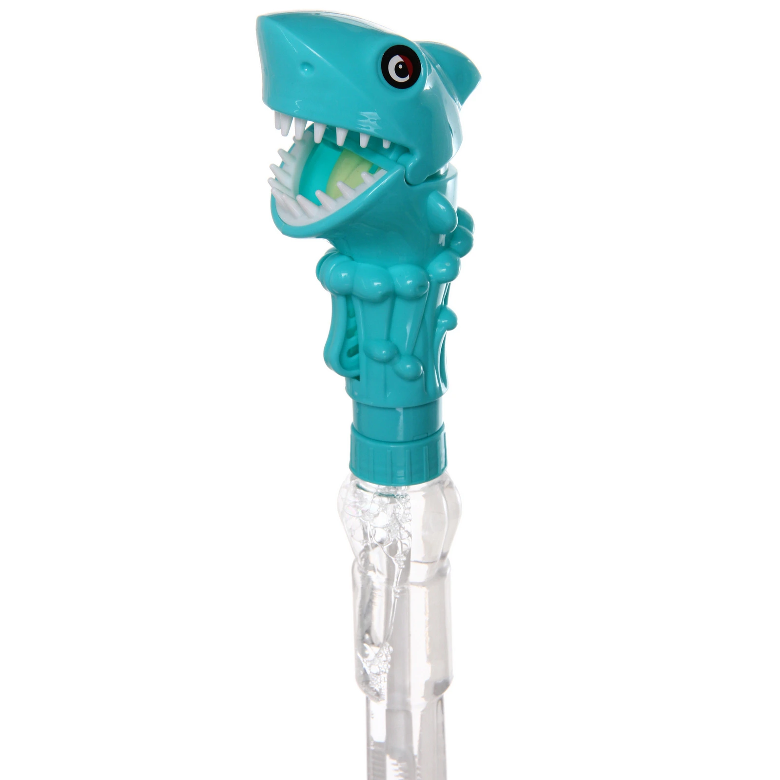 Флакон изготовлен из прозрачного пластика и заполнен мыльным раствором. Внутри расположена палочка для выдувания пузырей. Колпачок выполнен в виде акулы с открытой пастью, что делает игрушку особенно привлекательной для детей. Подходит для активных игр на улице и дома под присмотром взрослых.