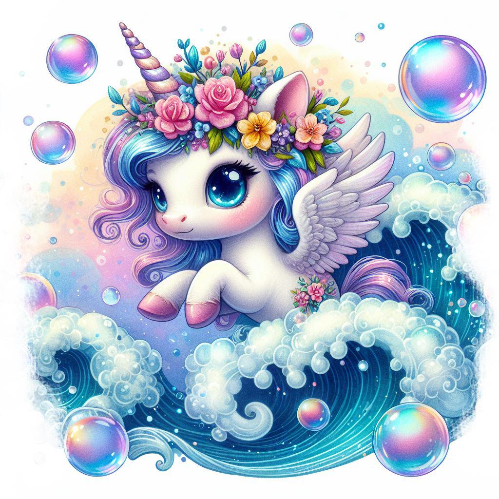 - Яркий дизайн с единорогом — красочная иллюстрация с крылатым единорогом среди волн и цветов привлекает внимание и нравится детям
