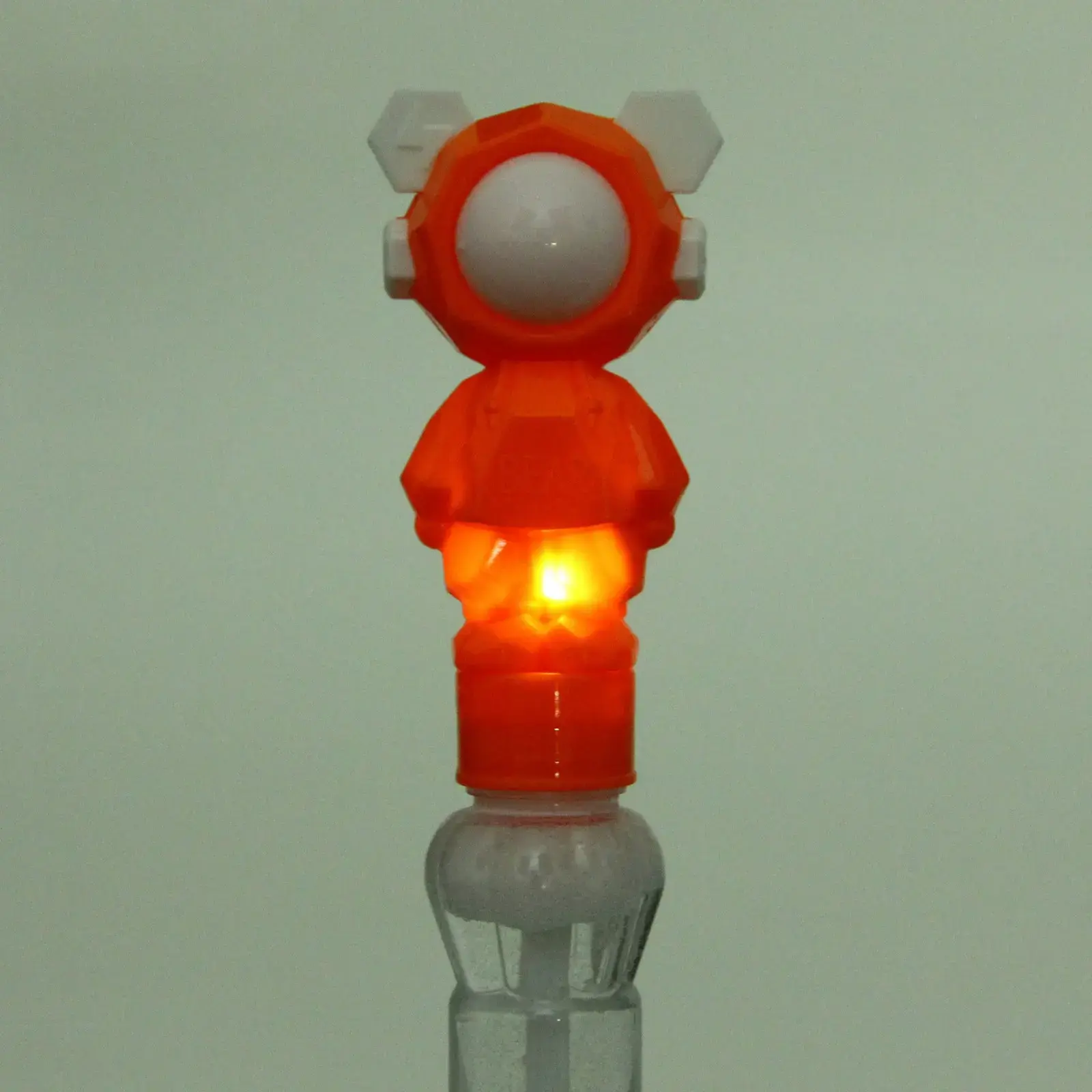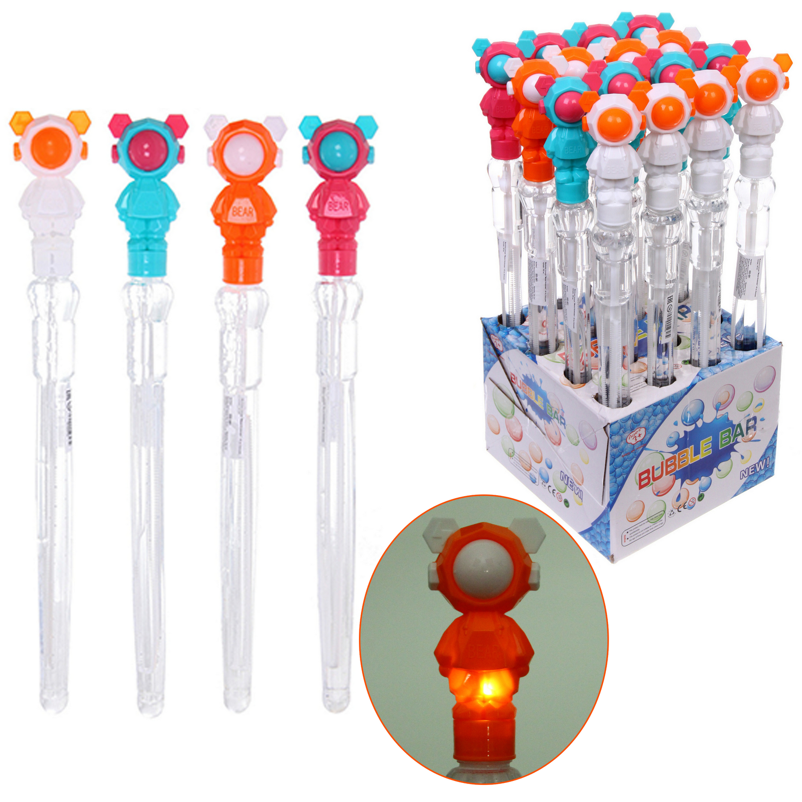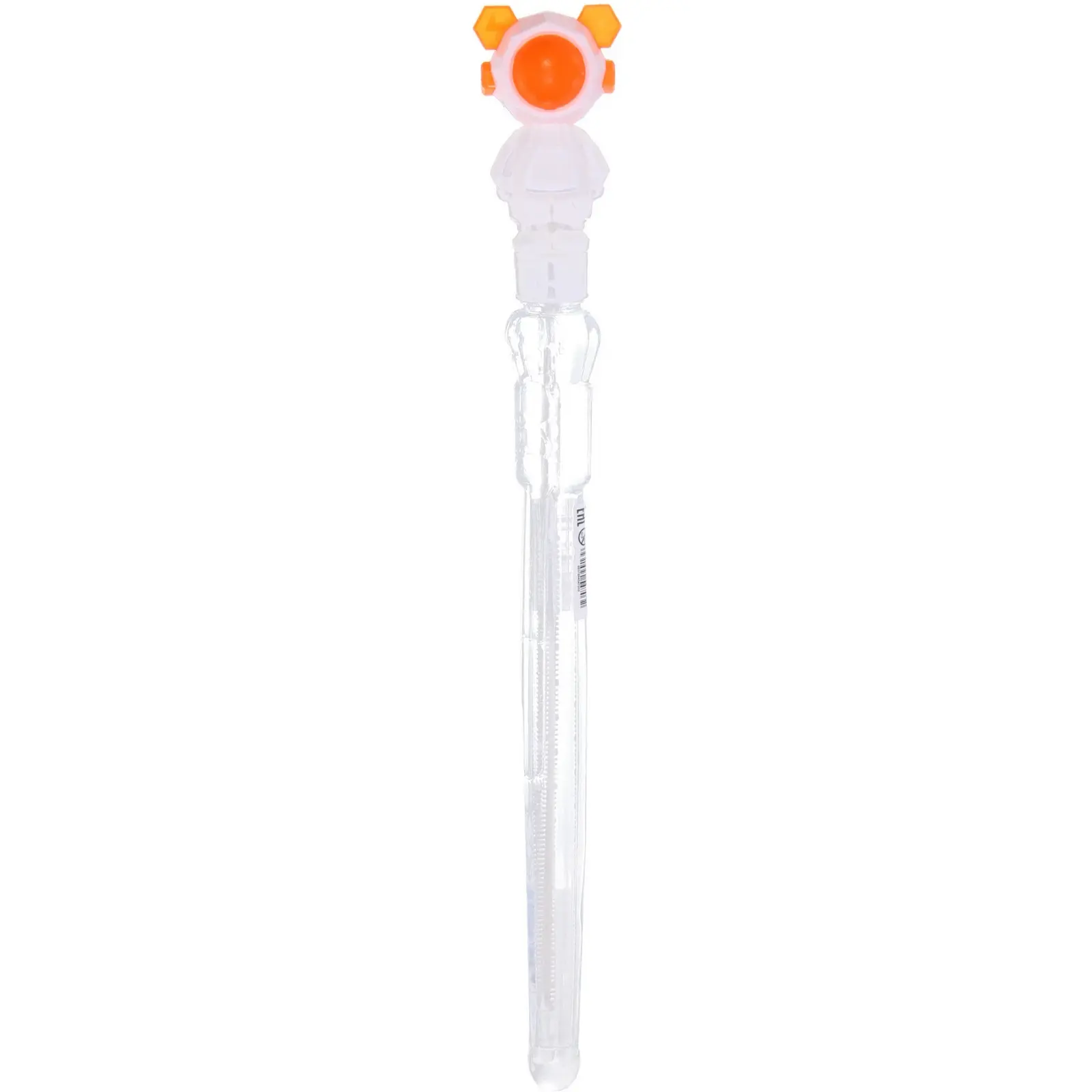 Мыльные пузыри поставляются в прозрачной колбе объемом 150 мл с красочным дизайном упаковки. Длина палочки составляет 45 см, что обеспечивает безопасное расстояние для игры. Верхняя часть выполнена в виде милого медвежонка-космонавта, который может светиться в темноте (при наличии батарейки).
