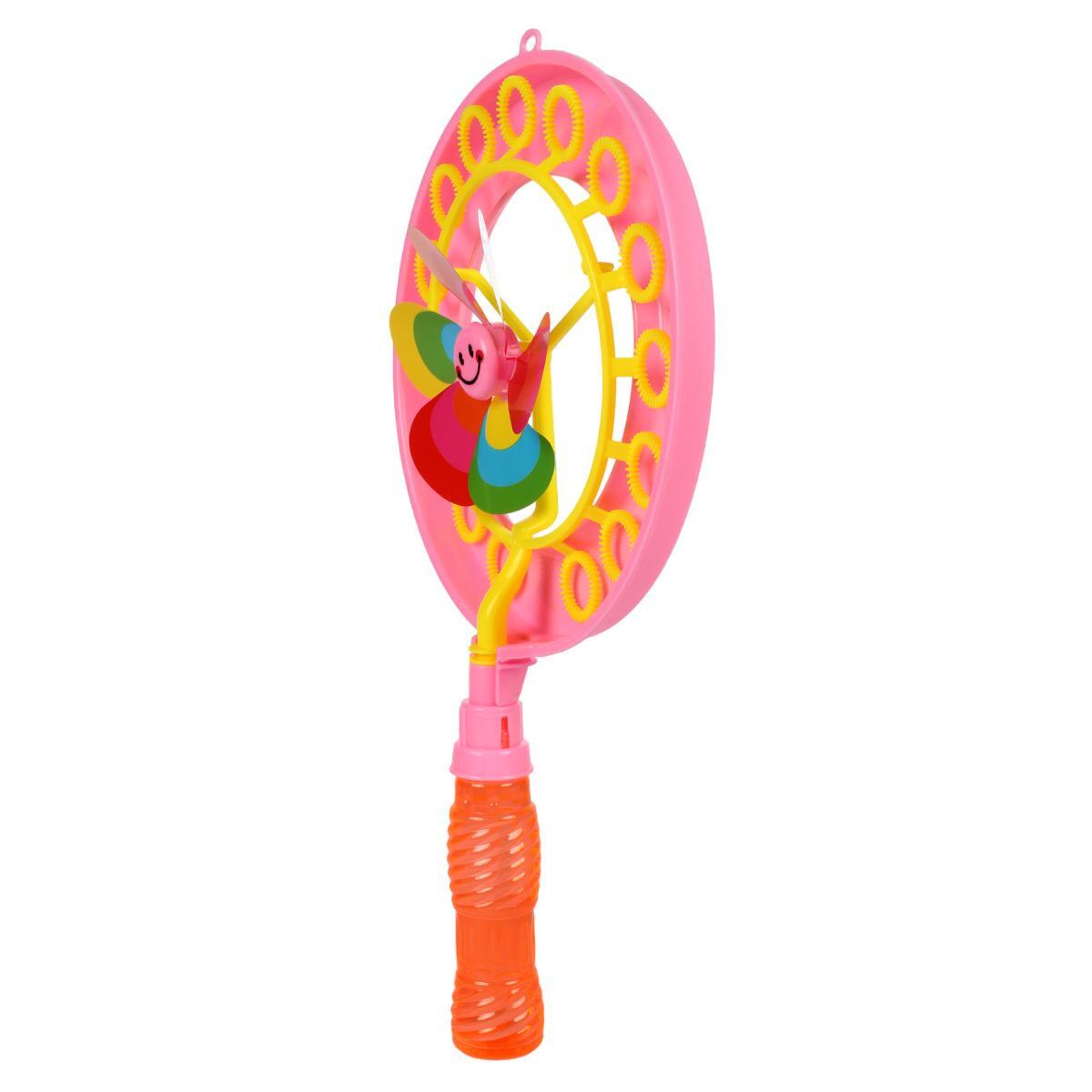 Комплектация включает: 1 пузырьковый диск диаметром 22 см с ветряным механизмом, съемную ручку длиной 39 см. Материал: экологичный пластик без резкого запаха. Цветовая гамма: микс из розового, голубого и оранжевого оттенков. Для использования с любыми мыльными растворами.
