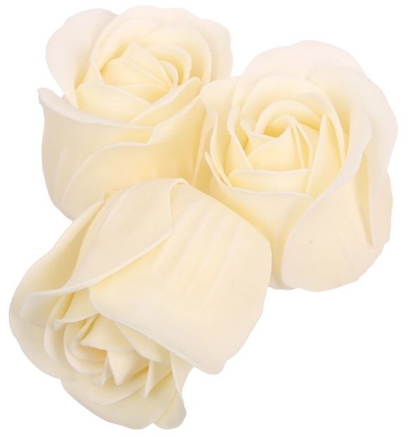 - Три мыльные розы молочного цвета выполнены в виде реалистичных бутонов с закрученными лепестками.
