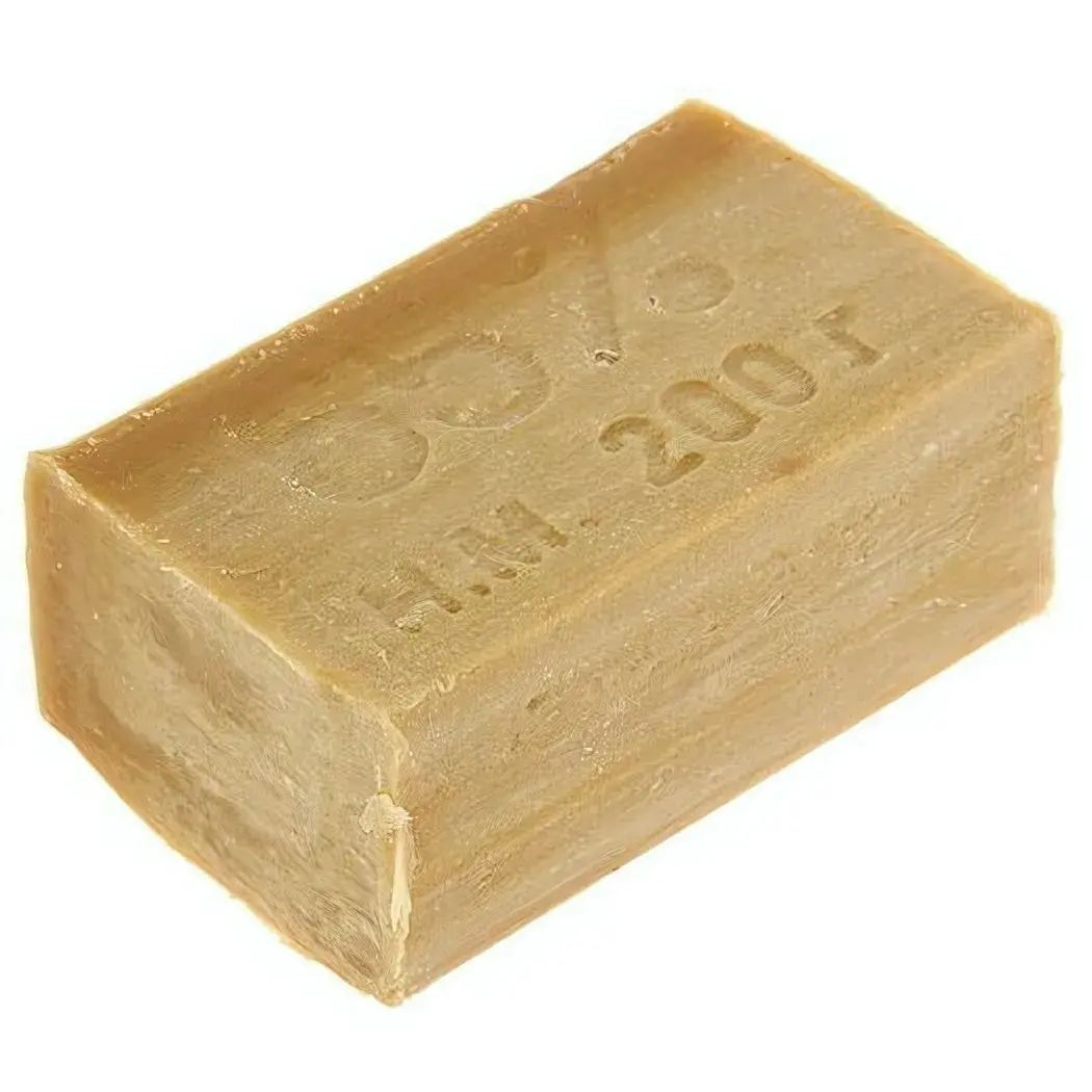 Размер бруска составляет 200г, что делает его компактным и удобным для хранения. Мыло имеет стандартные размерные характеристики, что позволяет легко использовать его в любых условиях. Цвет бруска светло-коричневый, а на его поверхности имеются тисненые надписи, указывающие на его характеристики.