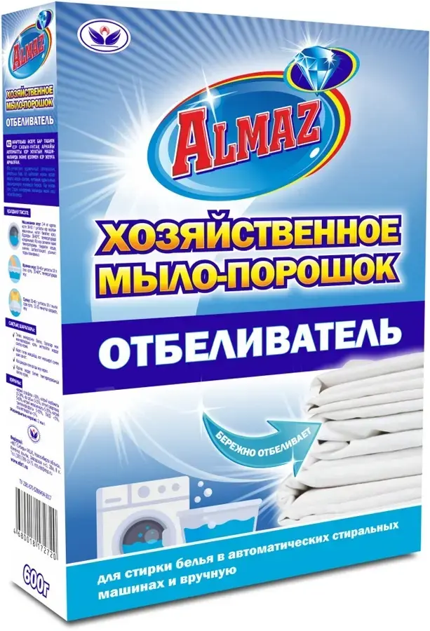 Упаковка мыла-порошка ALMAZ выполнена в ярких голубых и белых цветах, что делает его заметным на полке. На упаковке указаны все необходимые инструкции по применению, а также информация о том, как правильно использовать продукт для достижения наилучших результатов. Не упустите возможность сделать вашу стирку более эффективной и приятной с мылом-порошком ALMAZ!