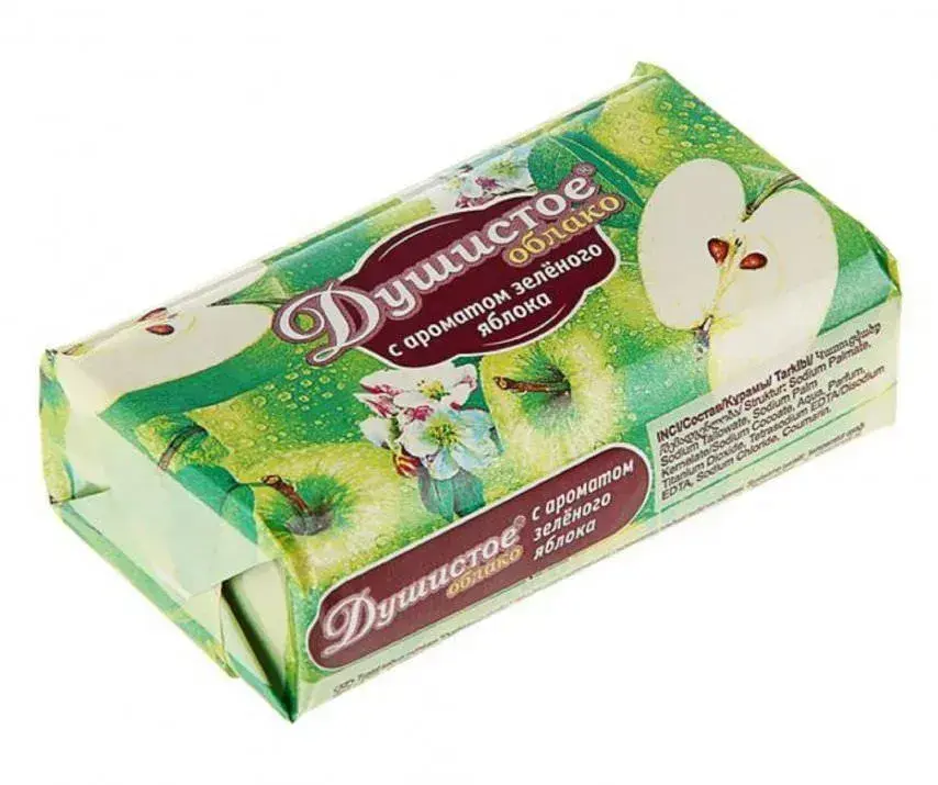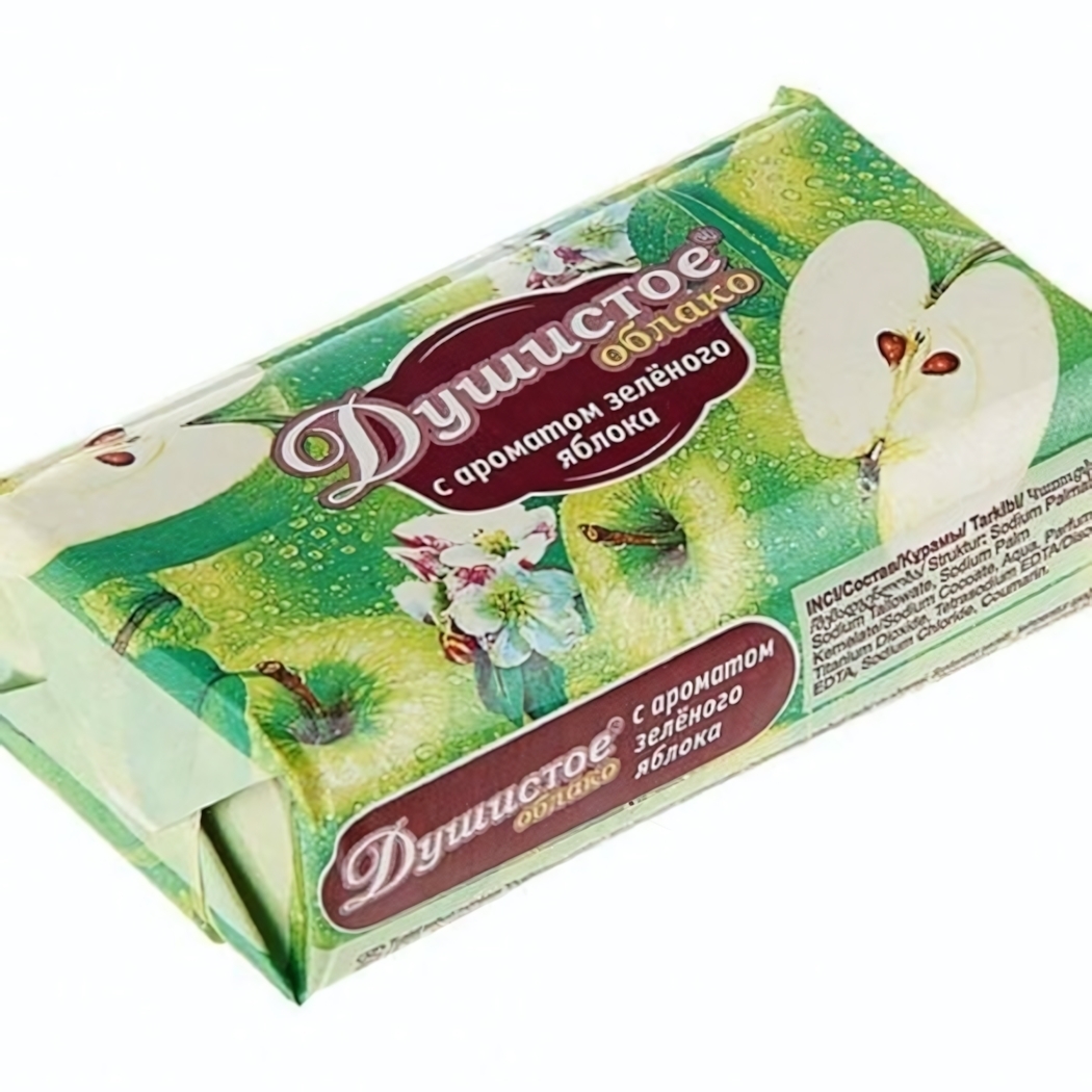 Упаковка мыла выполнена в ярком зеленом цвете с изображениями зеленых яблок и цветов, что делает его привлекательным на вид. Размер мыла составляет 90 г, что удобно для использования и хранения. Состав мыла включает натуральные ингредиенты, что делает его безопасным для здоровья.