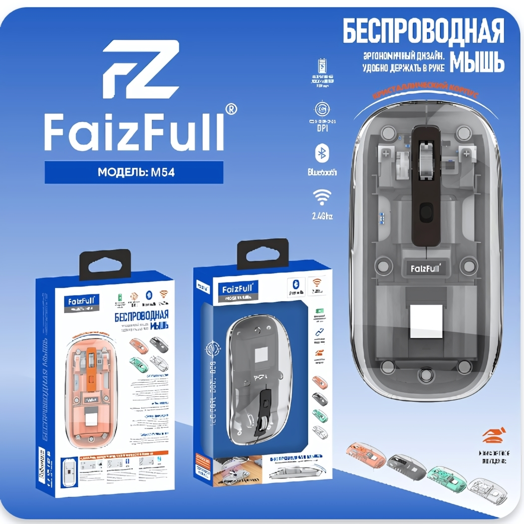 Беспроводная мышь FaizFull M54 станет вашим надежным помощником в работе и развлечениях. Благодаря поддержке двух режимов подключения — Bluetooth и 2.4Ghz — вы получаете максимальную универсальность для любого устройства.