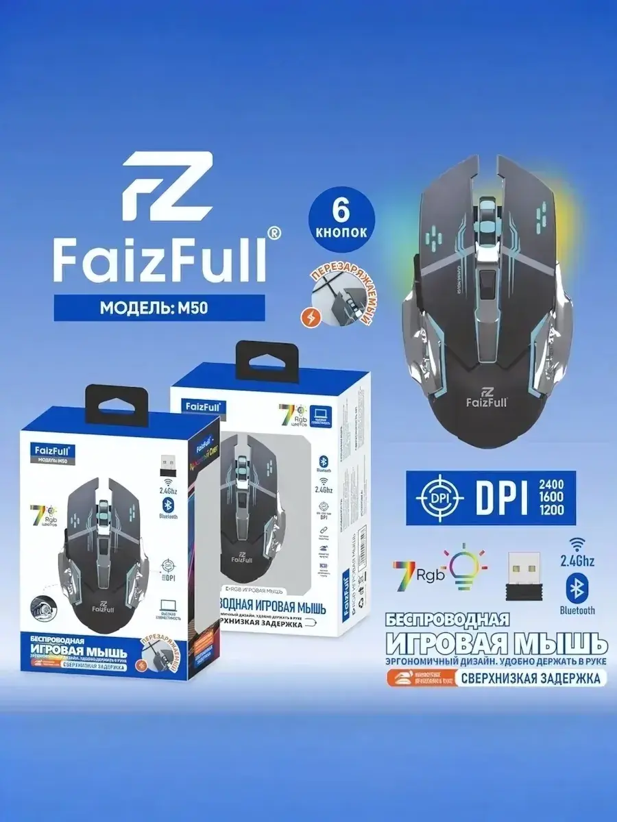 Откройте для себя комфорт и высокую точность с мышью FaizFull M50, созданной для настоящих геймеров и тех, кто ценит качество и надежность. Благодаря беспроводной связи по технологиям 2.4Ghz и Bluetooth, вы получаете свободное движение без ограничений кабелями, а эргономичный дизайн обеспечивает удобство при длительной игре и работе.
