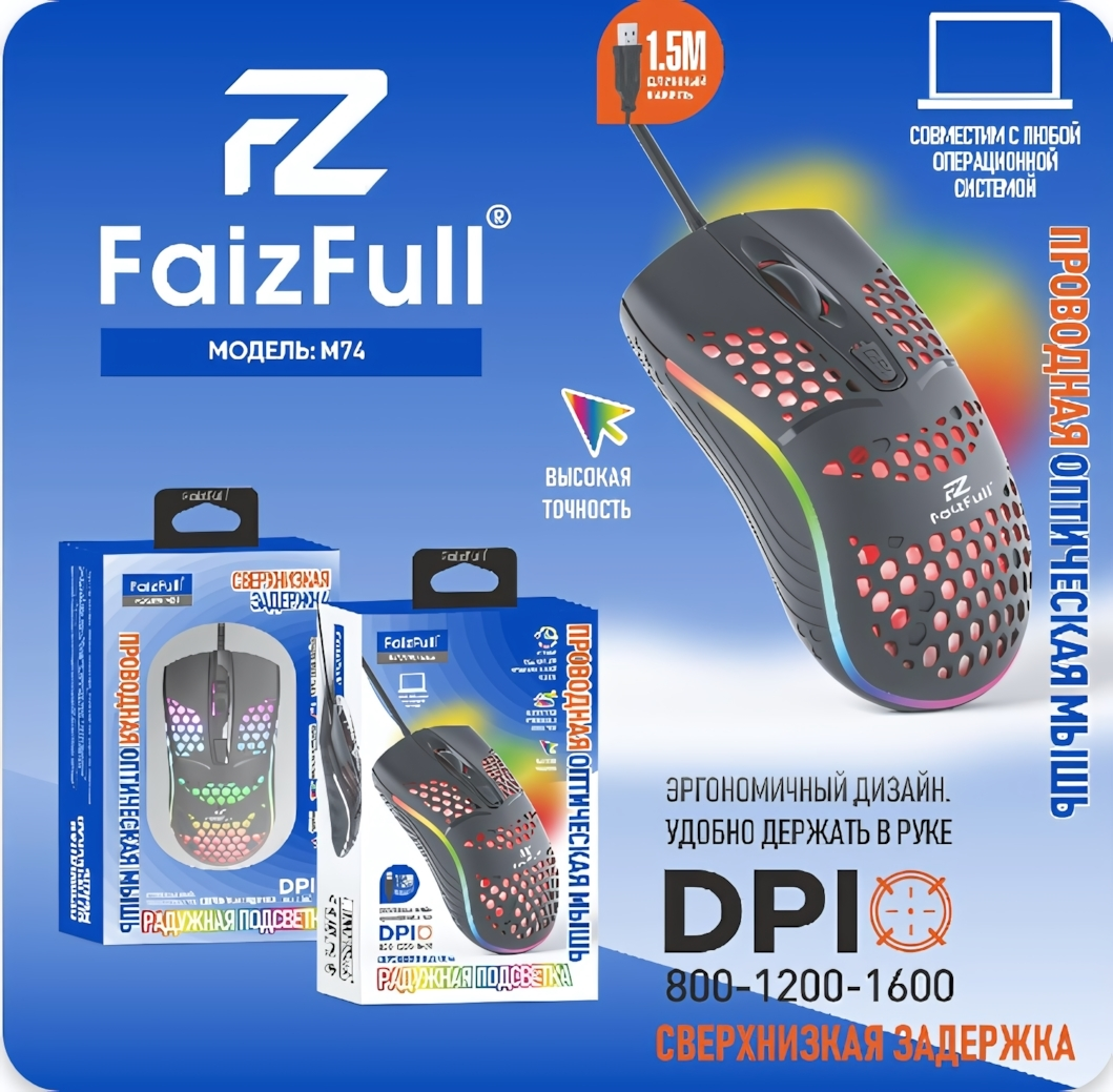 Мышь проводная игровая FAIZFULL M74, 1600 DPI, 4 кнопки, RGB-подсветка, эргономичный дизайн, 1.5м USB, черный