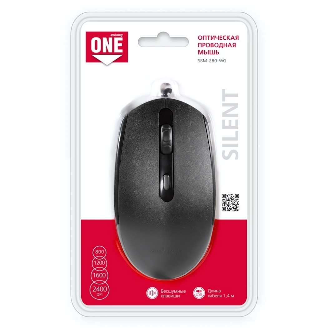 Мышь проводная 'SBM-280-K Black', бесшумные кнопки, эргономичная, 4 уровня DPI (800-2400), кабель 1.4 м