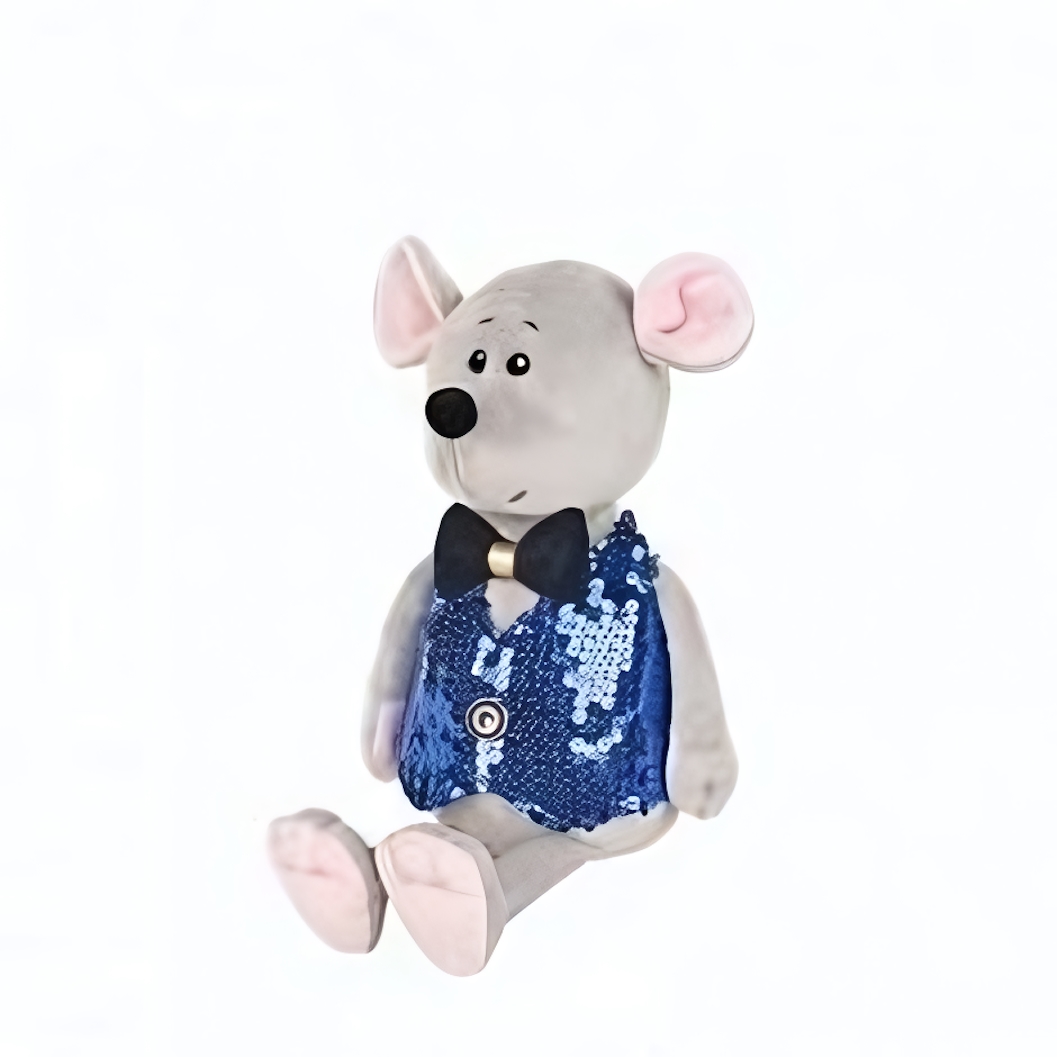 Познакомьтесь с Мышонком Стасиком — изящным и стильным другом, который станет не только игрушкой, но и настоящим помощником в воспитании любви к искусству у ваших детей. Его светло-серая шерстка, задорная улыбка и аккуратный черный носик делают его неотразимым. Стасик всегда готов к культурным мероприятиям, и его стильная синяя жилетка с пайетками и черная бабочка подчеркивают его утонченный вкус.