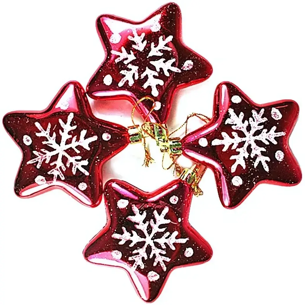 Набор ёлочных украшений Звезда, прозрачные красные с белым узором, 7 см, 4 шт, на золотистой нити с зажимами