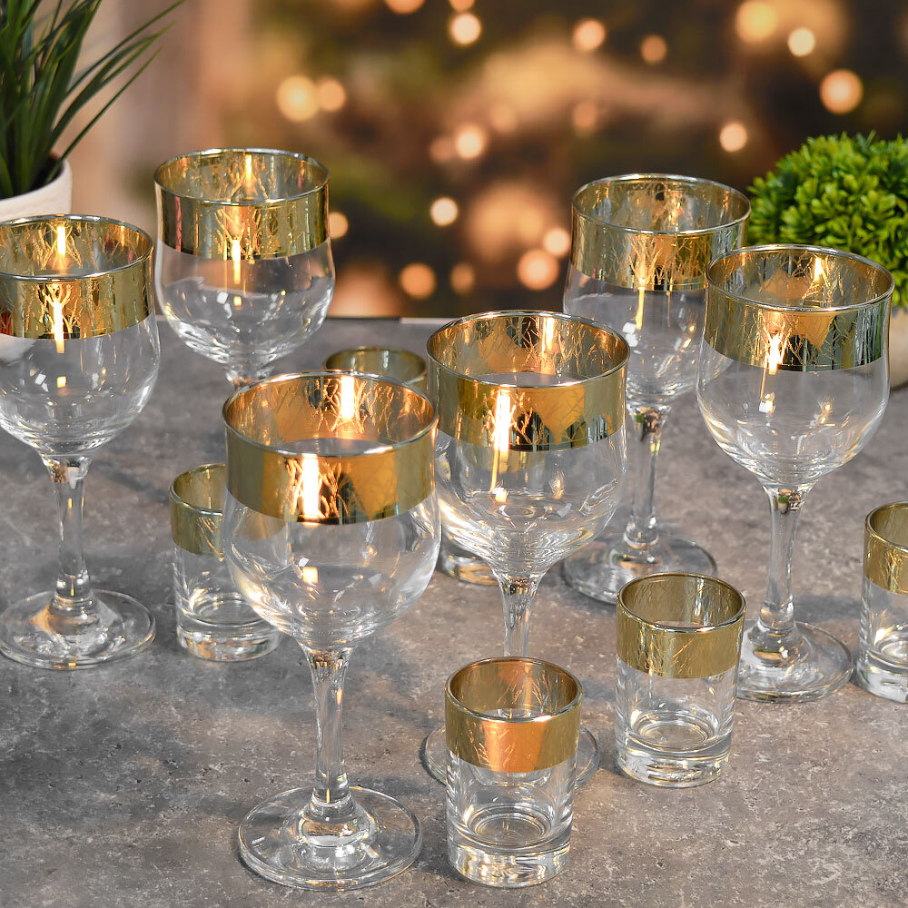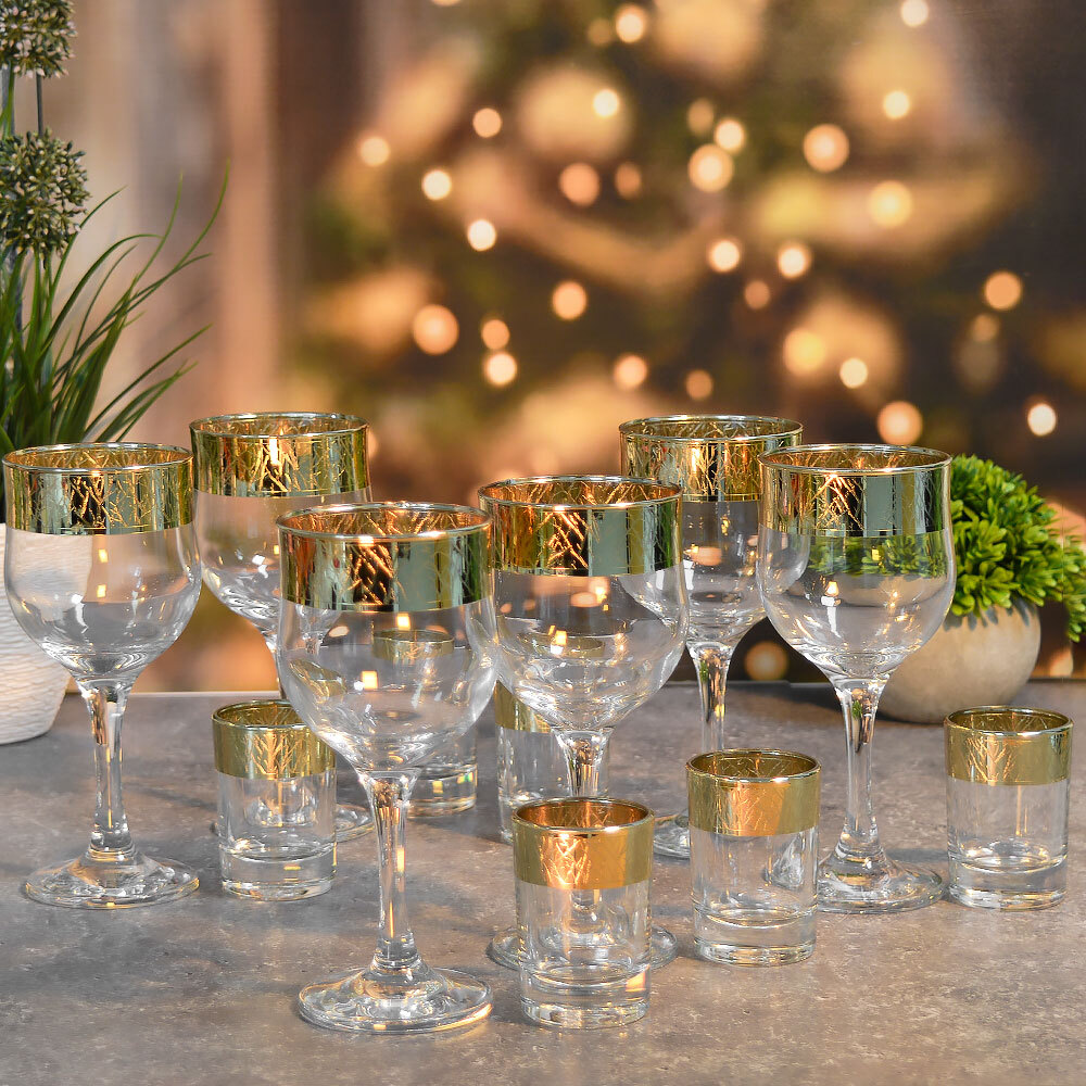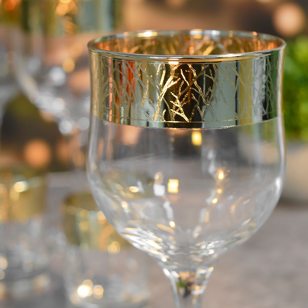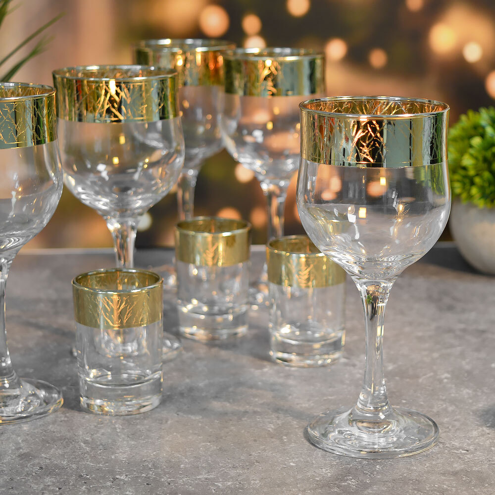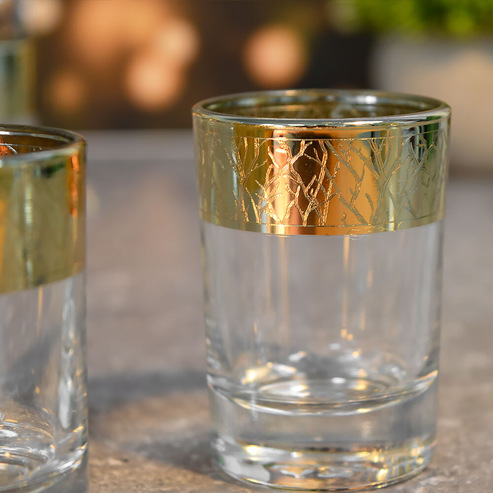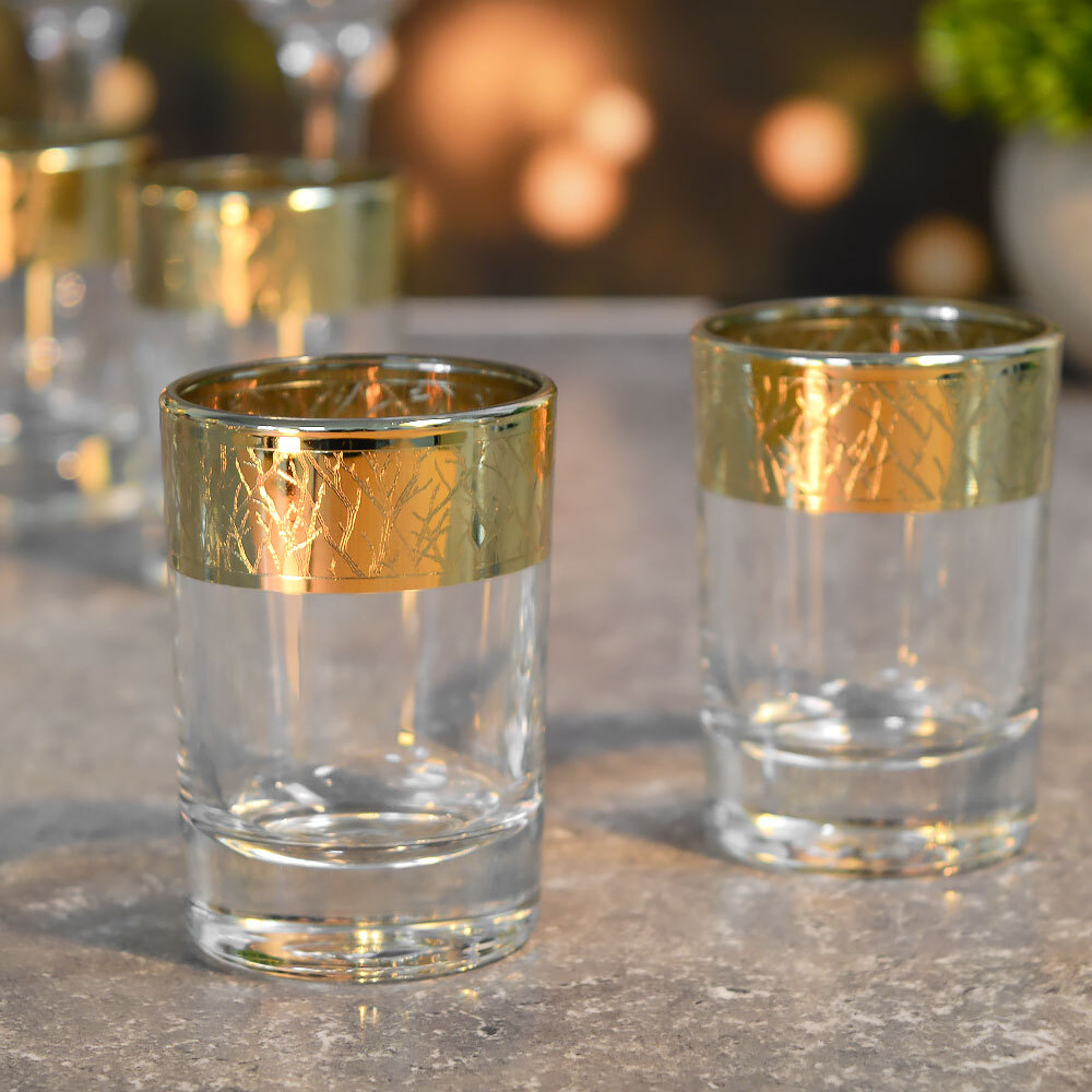 Материал изделия — прочное стекло, устойчивое к механическим воздействиям и химическим очистителям. Золотая отделка не тускнеет со временем и легко переносит мойку вручную или в посудомоечной машине (при правильных условиях). Этот набор отлично подчеркнет любой интерьер и станет стильным дополнением к сервировке стола, придавая ей праздничную нотку.