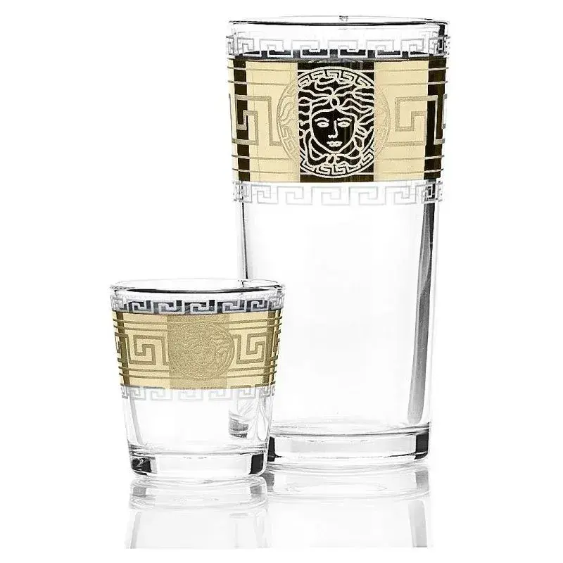 Изделия изготовлены из прочного прозрачного стекла, украшены изящным золотистым орнаментом с элементами греческого стиля. Античные мотивы, включая изображение головы Медузы, придают посуде особый шарм.