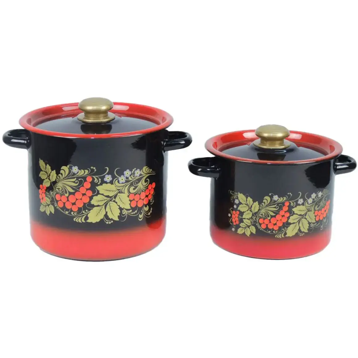 Набор из двух кастрюль объёмом 3,5 и 5,5 литров сочетает функциональность и эстетику. Золотистый узор с ягодами и листьями на красно-чёрном фоне добавит уюта вашему интерьеру, а прочное эмалированное покрытие обеспечит долгий срок службы.