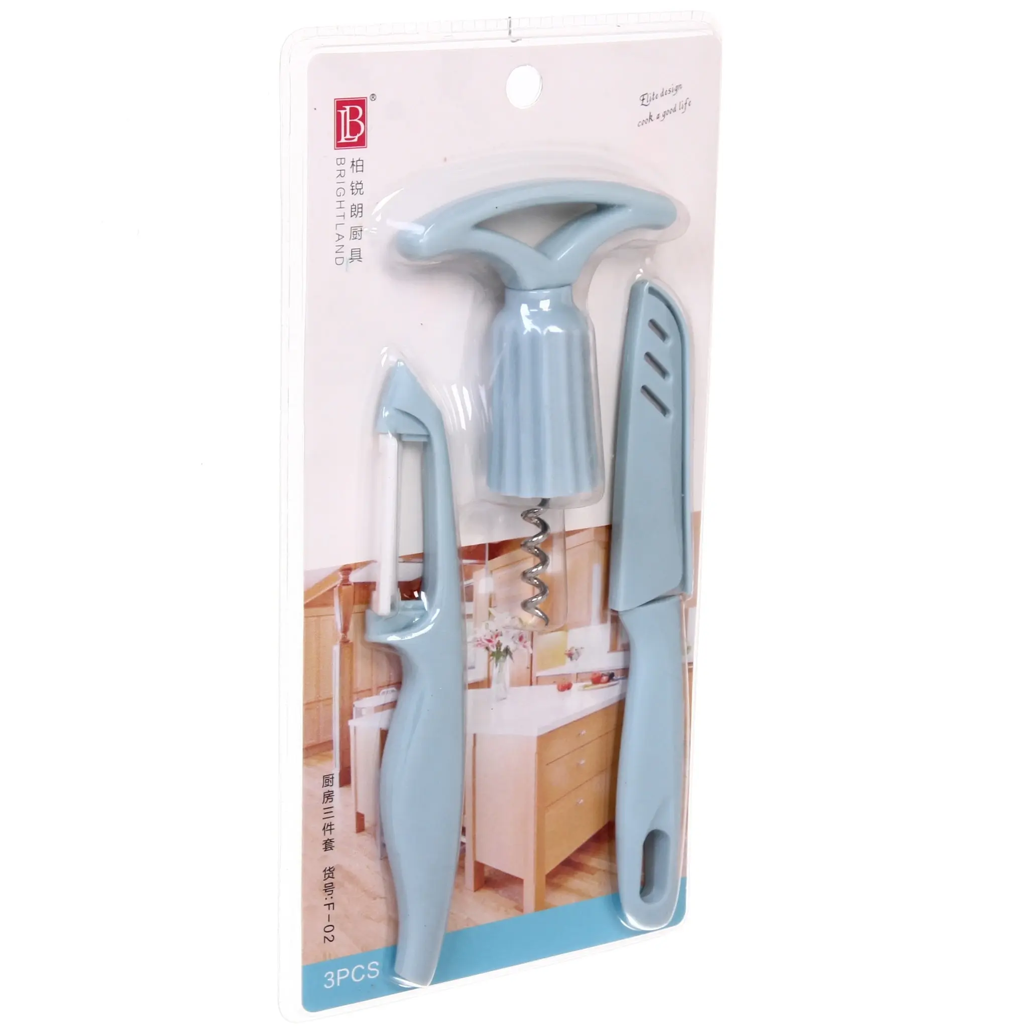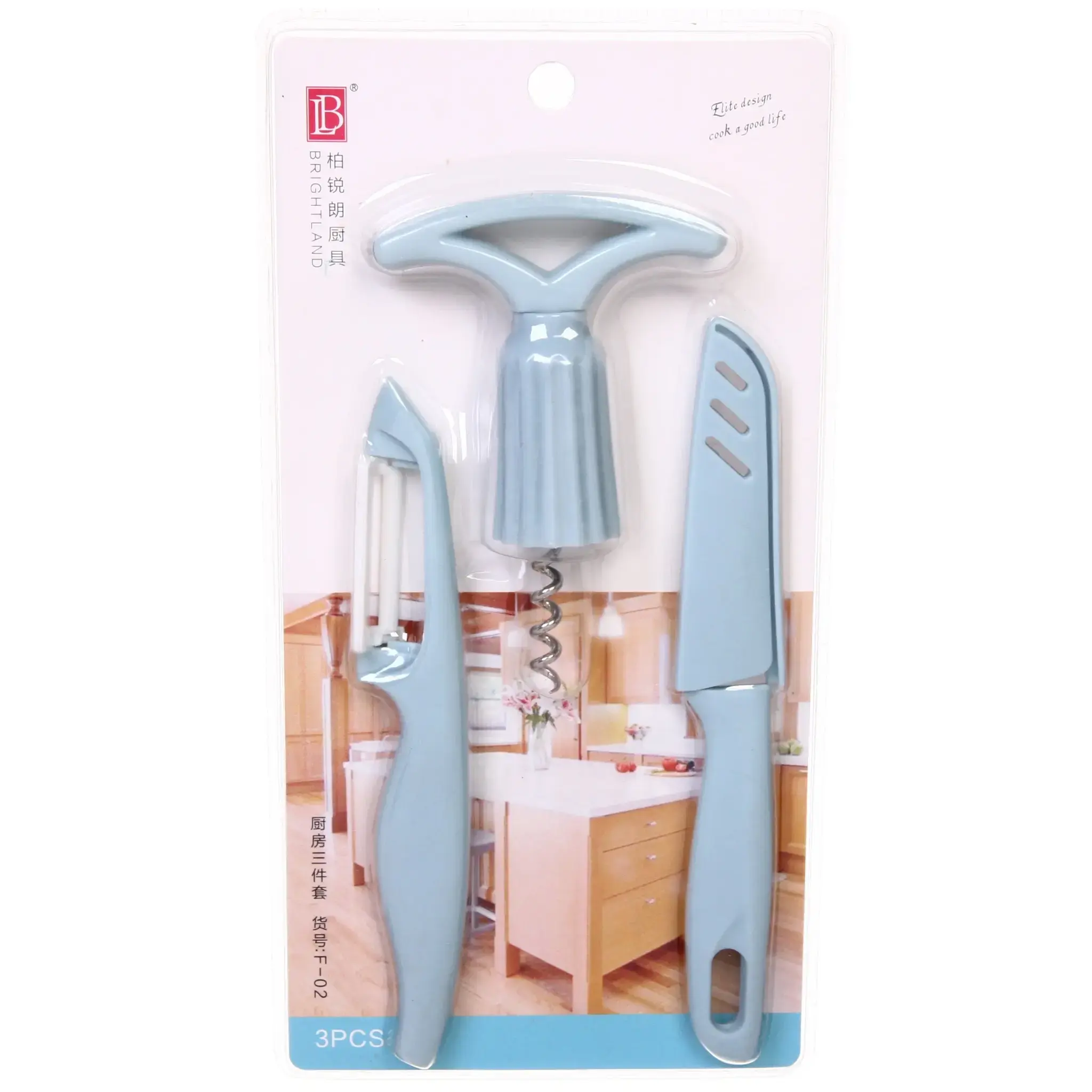 Набор включает три предмета: нож, овощечистку и штопор, все выполнены в голубом цвете. Инструменты имеют стандартные размеры, что делает их удобными для хранения и использования. Упаковка представляет собой прозрачный блистер, позволяющий видеть все элементы набора, что делает его отличным выбором как для личного использования, так и в качестве подарка.