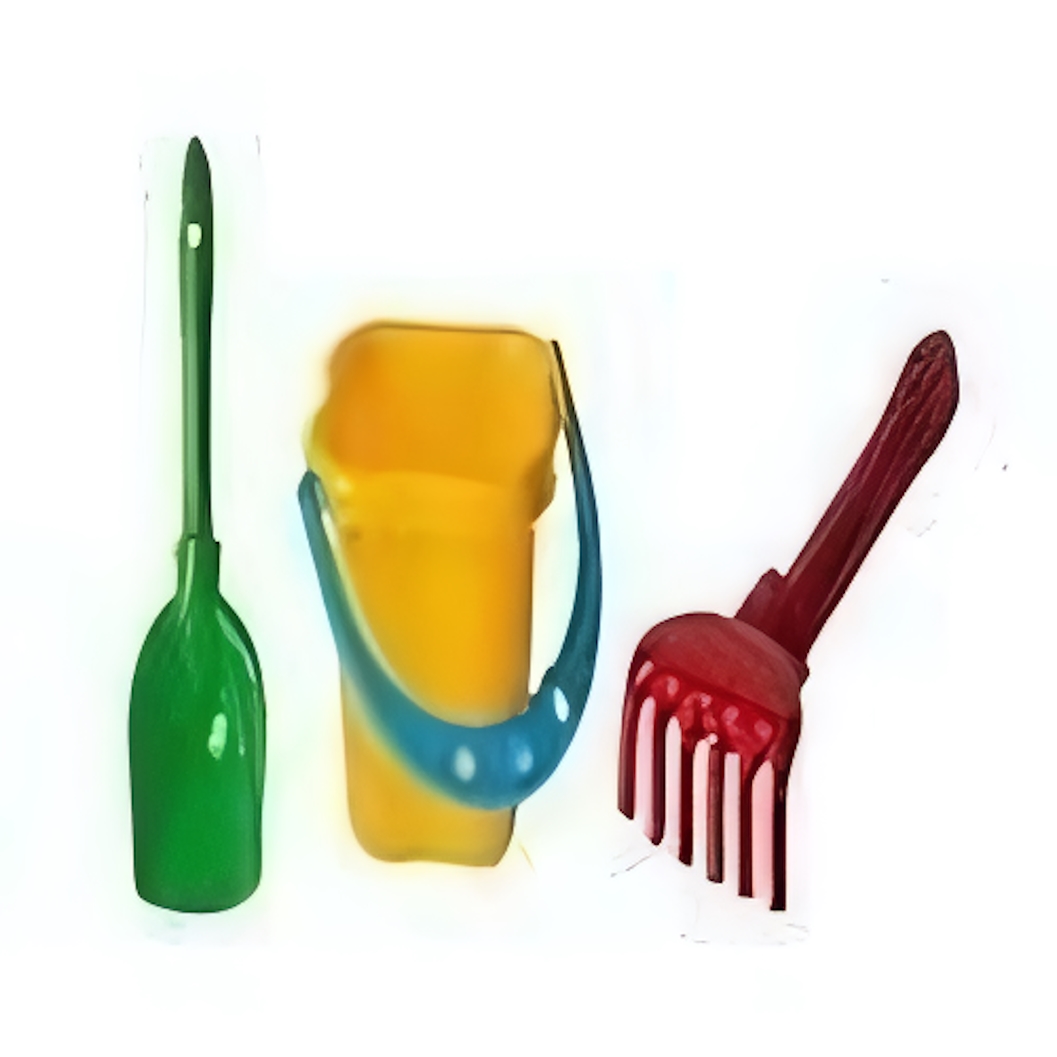 - Ведро: Желтое ведро с удобной синей ручкой идеально подходит для переноски песка и воды.