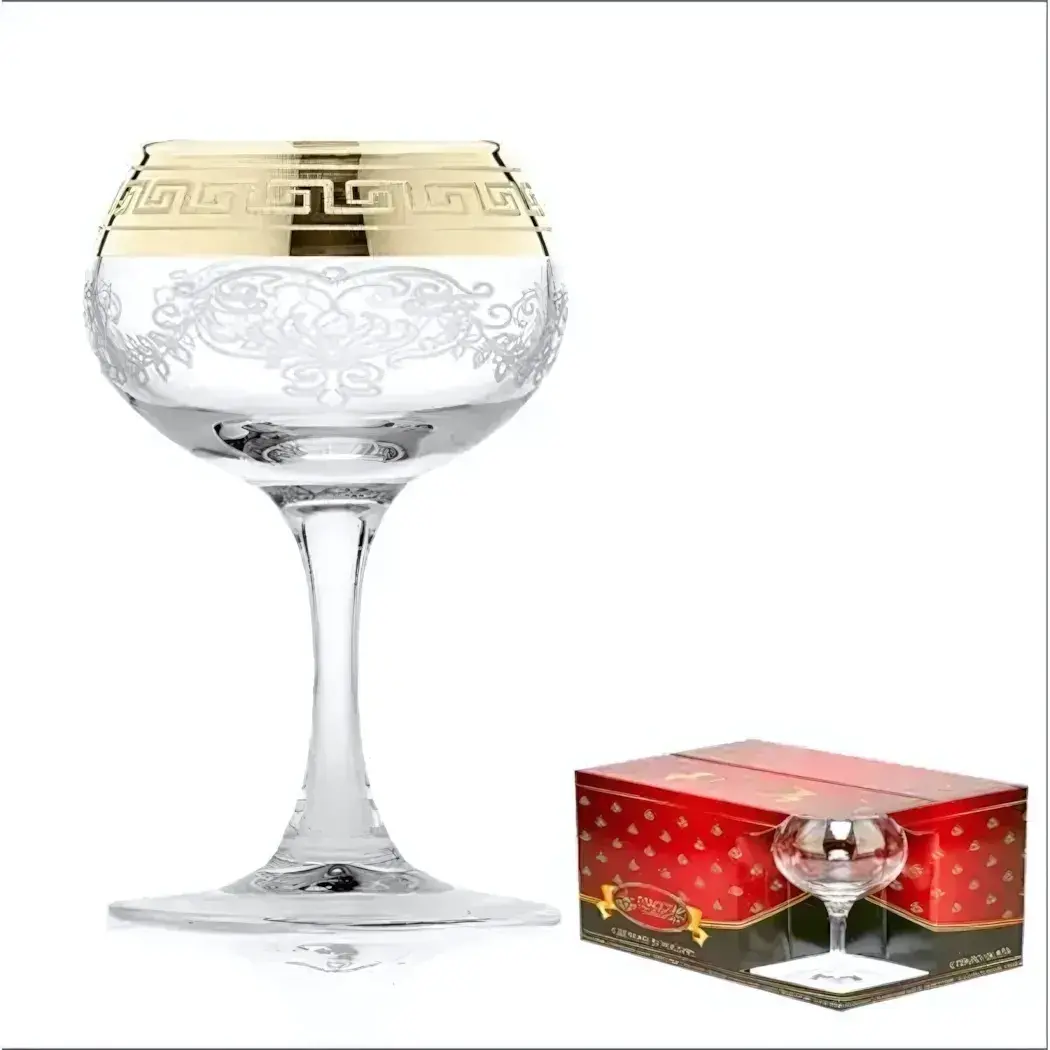 Набор включает 6 идентичных фужеров, упакованных в подарочную коробку с золотым тиснением. Прямоугольная форма упаковки обеспечивает безопасное хранение и транспортировку. Тонкая ножка и сбалансированная конструкция бокалов обеспечивают удобный захват.