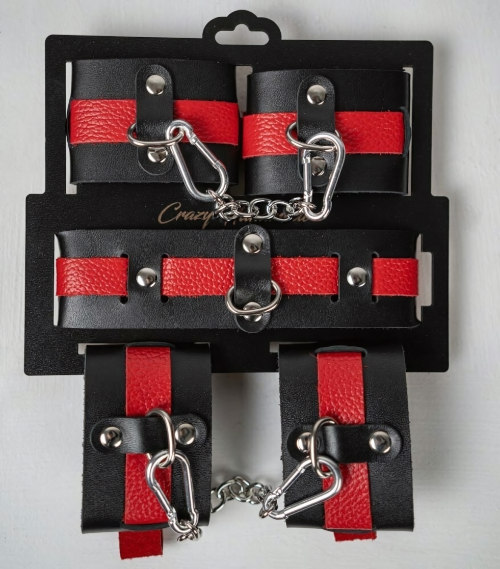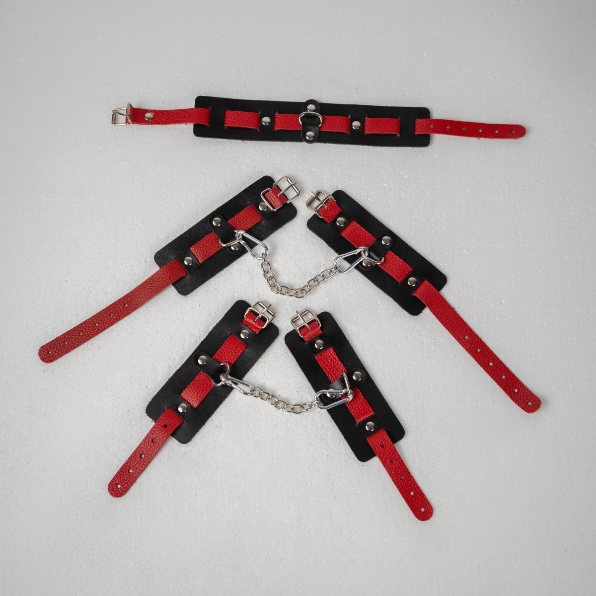 Этот набор аксессуаров БДСМ создан для тех, кто ценит стиль, комфорт и надежность. Черно-красное сочетание добавляет игривости, а натуральная кожа гарантирует долговечность.