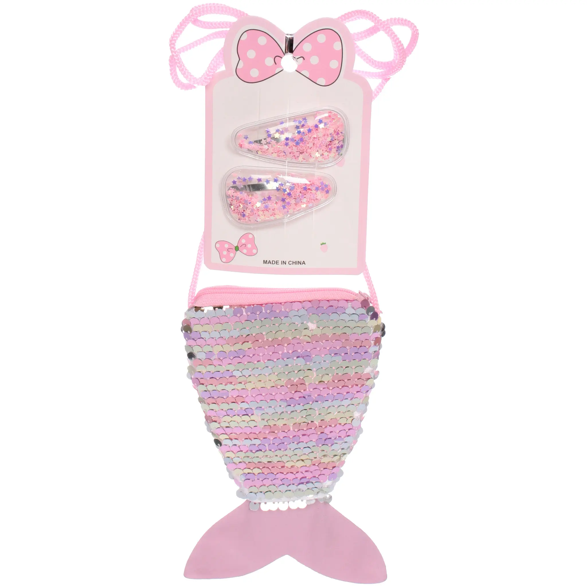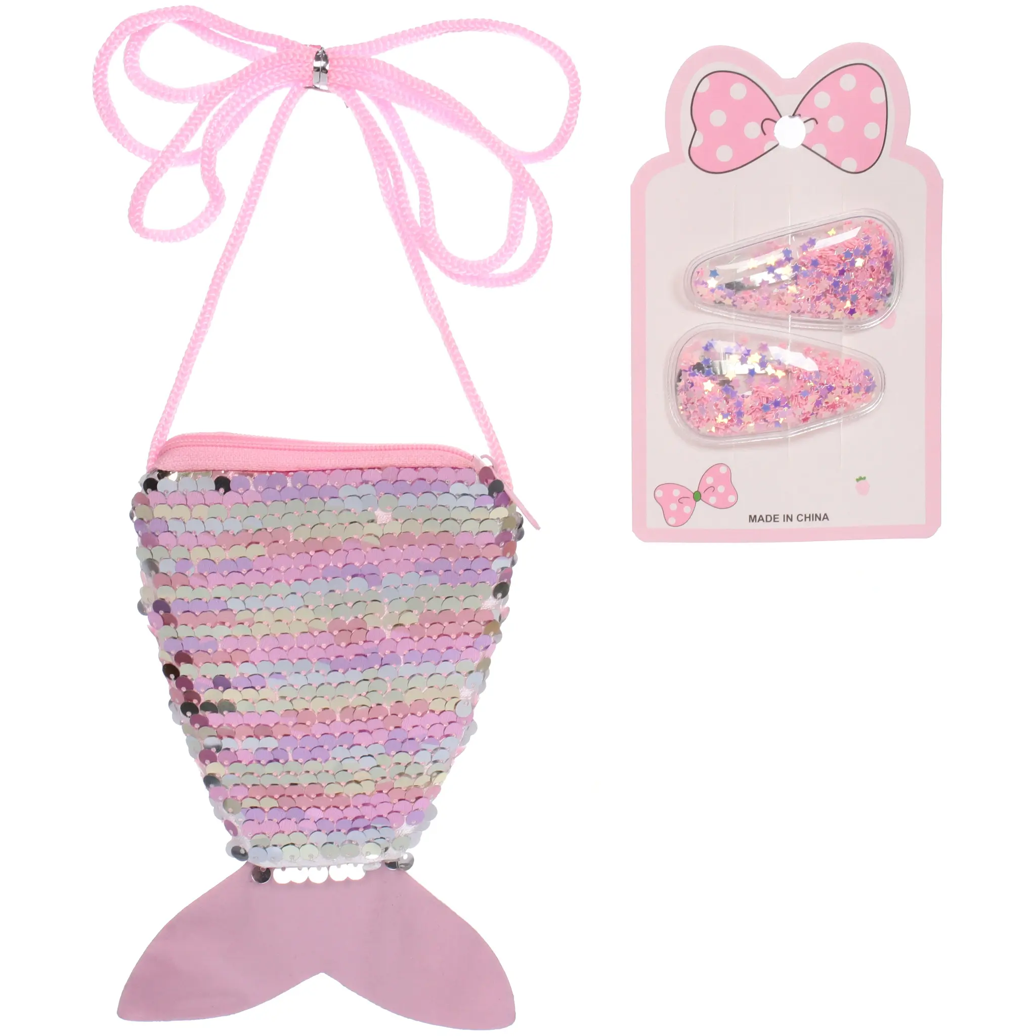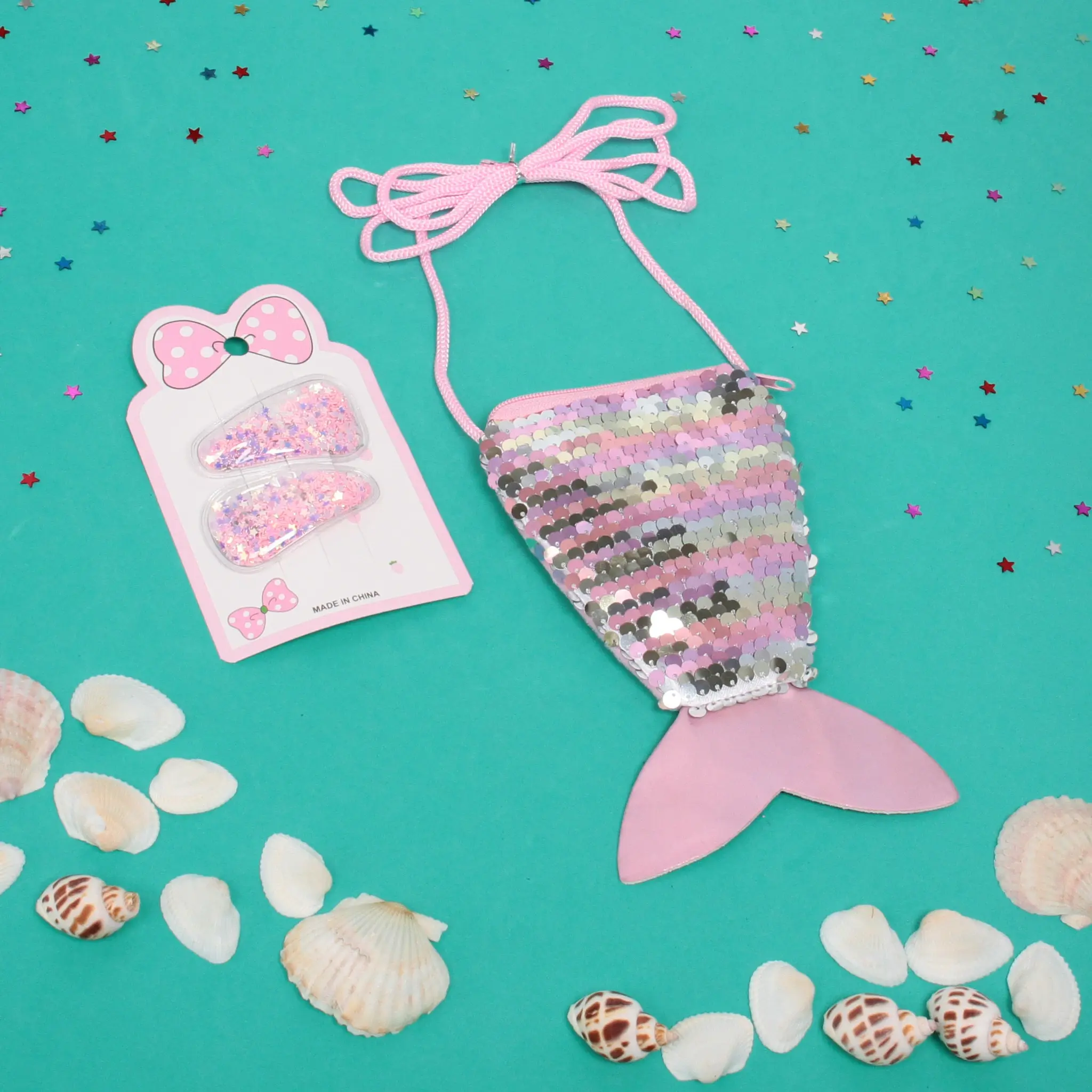 Благодаря продуманному сочетанию элементов, набор не только украшает, но и функционален. Сумочка выполнена из качественных материалов с использованием блестящих пайеток, создающих радужное сияние. Заколки надежно держат волосы и не травмируют нежную детскую кожу.