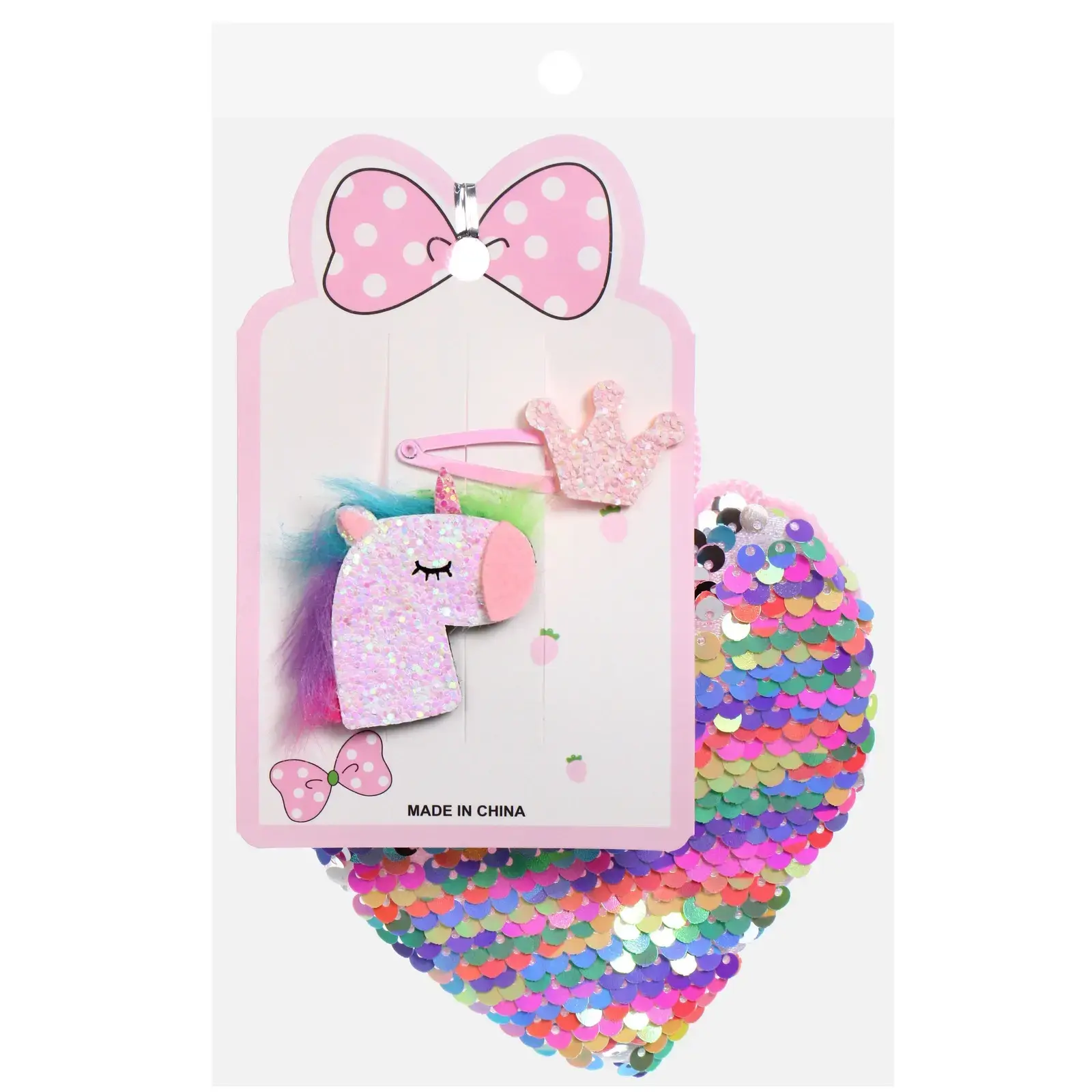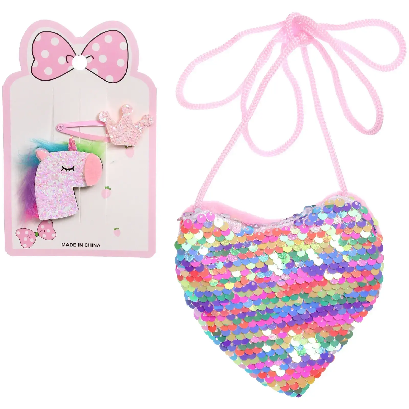 Заколки выполнены в пастельных тонах с блестящими элементами, а сумочка украшена разноцветными пайетками, которые переливаются при движении. Этот набор станет отличным подарком для дня рождения, праздника или просто для поднятия настроения. Не упустите возможность сделать вашу маленькую модницу ещё более стильной!