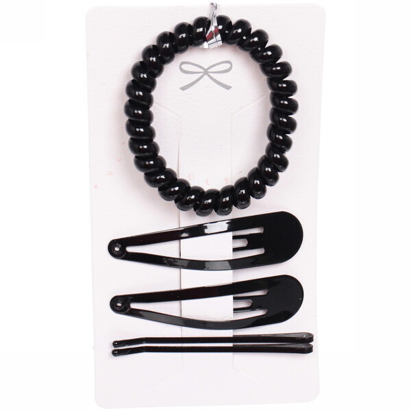Почему стоит выбрать именно этот набор? Во-первых, он выполнен из качественных материалов: металл и пластик обеспечивают долговечность и надежность. Во-вторых, черный цвет аксессуаров делает их универсальными и подходящими к любому наряду. В-третьих, компактные размеры (резинка d-5 см, зажимы 5,5*1,5 см) позволяют легко носить их с собой в сумочке.