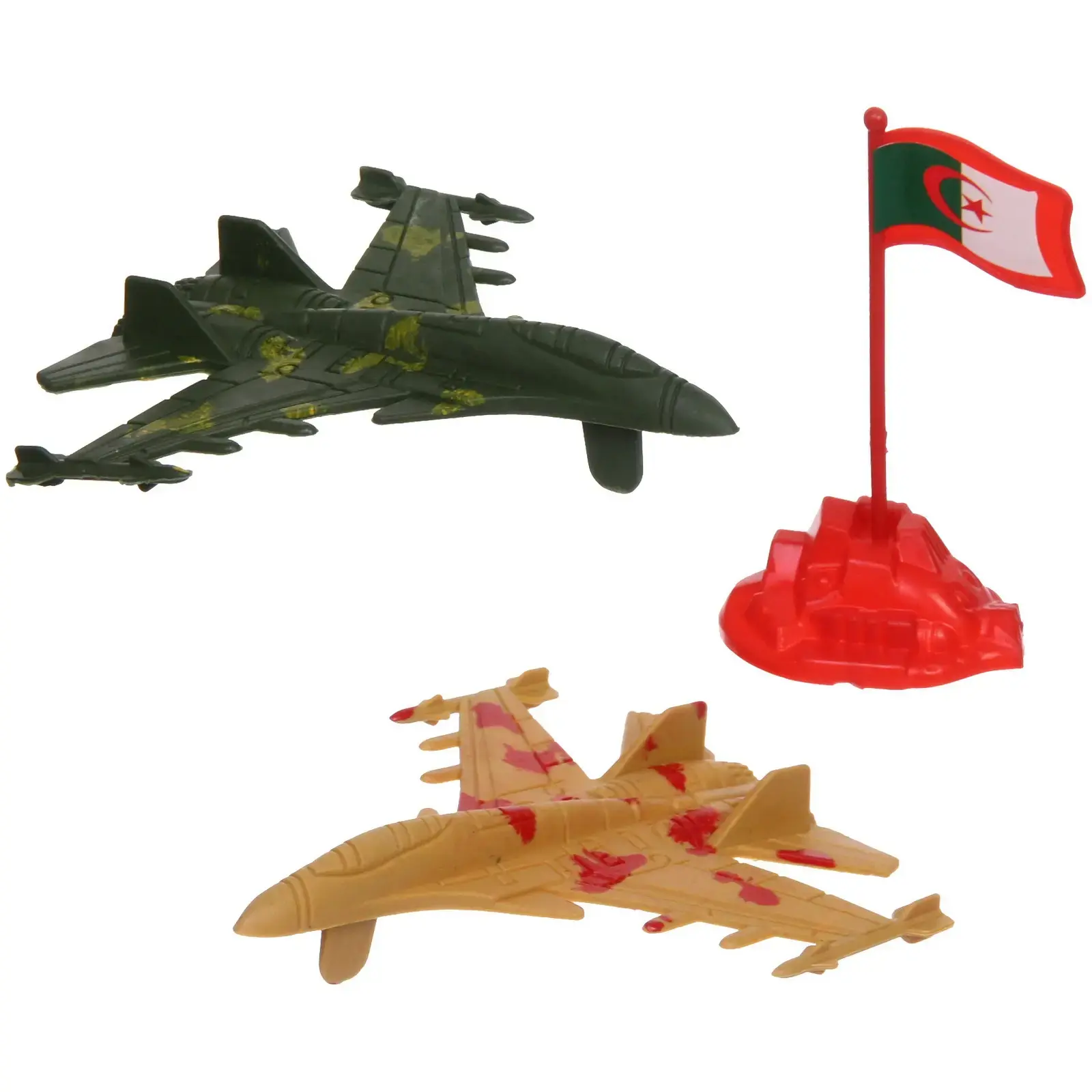 Фигурки солдат представлены в двух основных цветах: светлом (бежевом) и темно-зеленом. Самолеты также имеют яркие расцветки, что делает игру более увлекательной. Флаг с символикой Алжира добавляет тематическую нотку и позволяет детям узнать больше о разных странах.