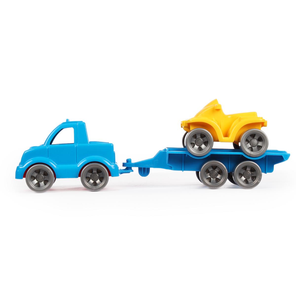 - Грузовик сине-голубого цвета с платформой для перевозки