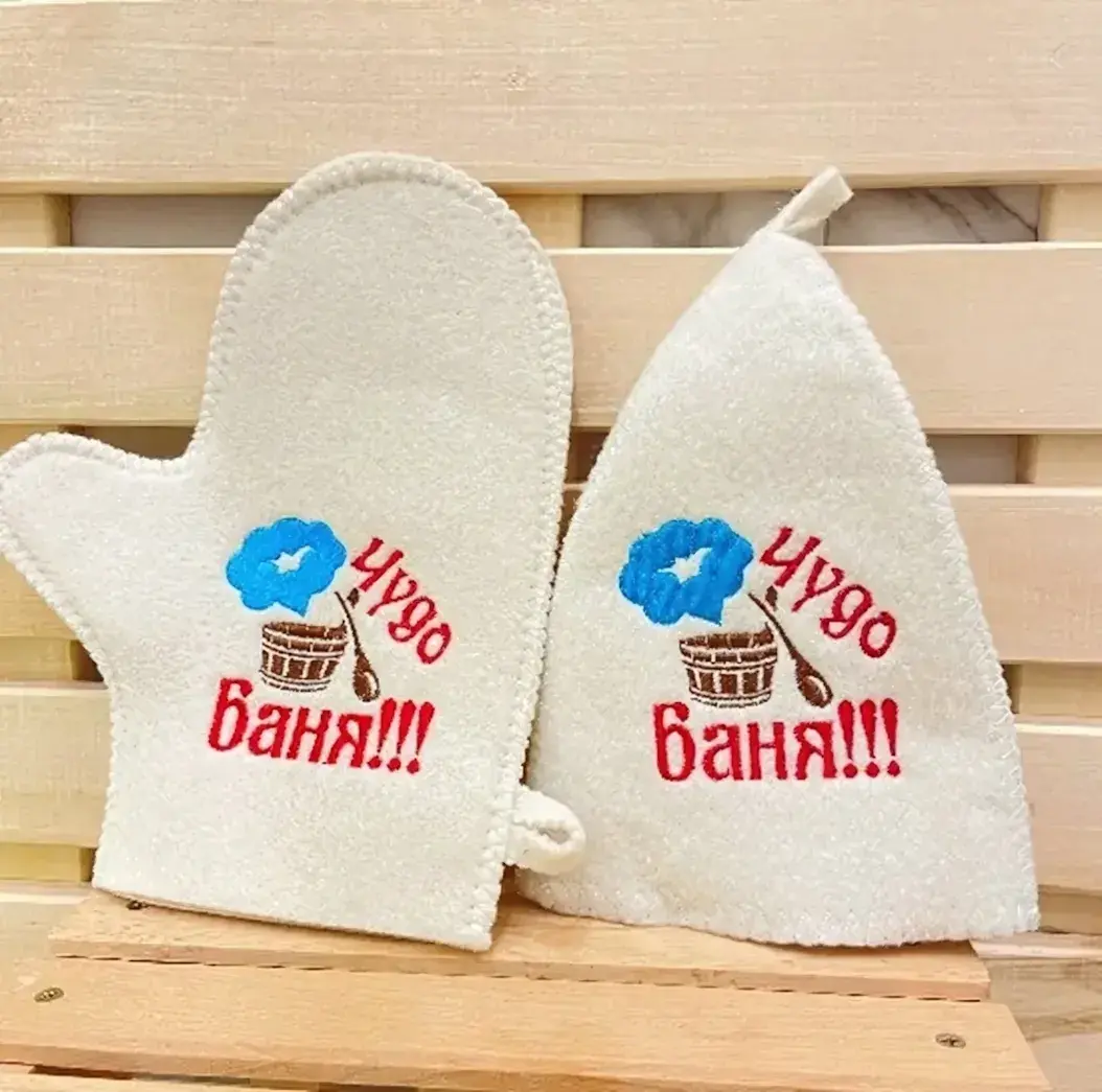 Защитите руки от горячего пара и завершите образ традиционной банной шапкой. Набор из войлока с тематической вышивкой сочетает практичность и стильный дизайн.