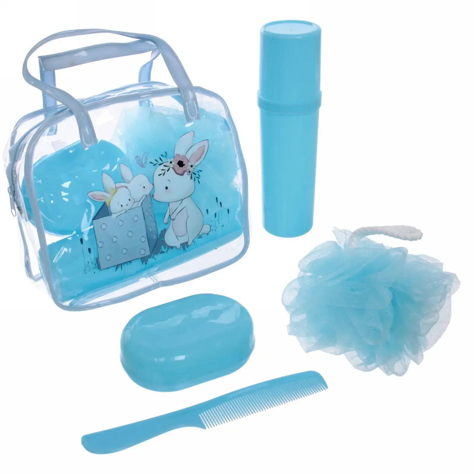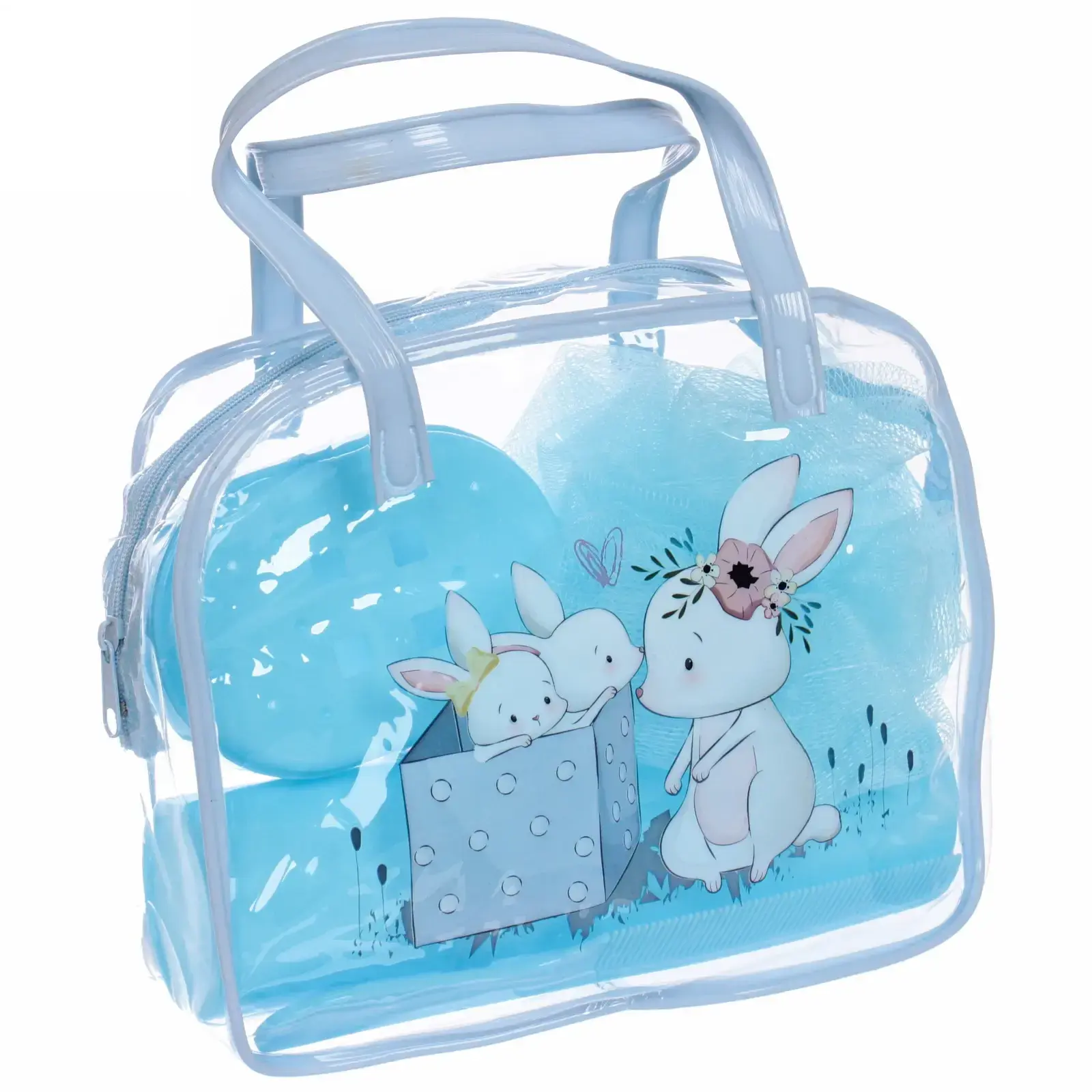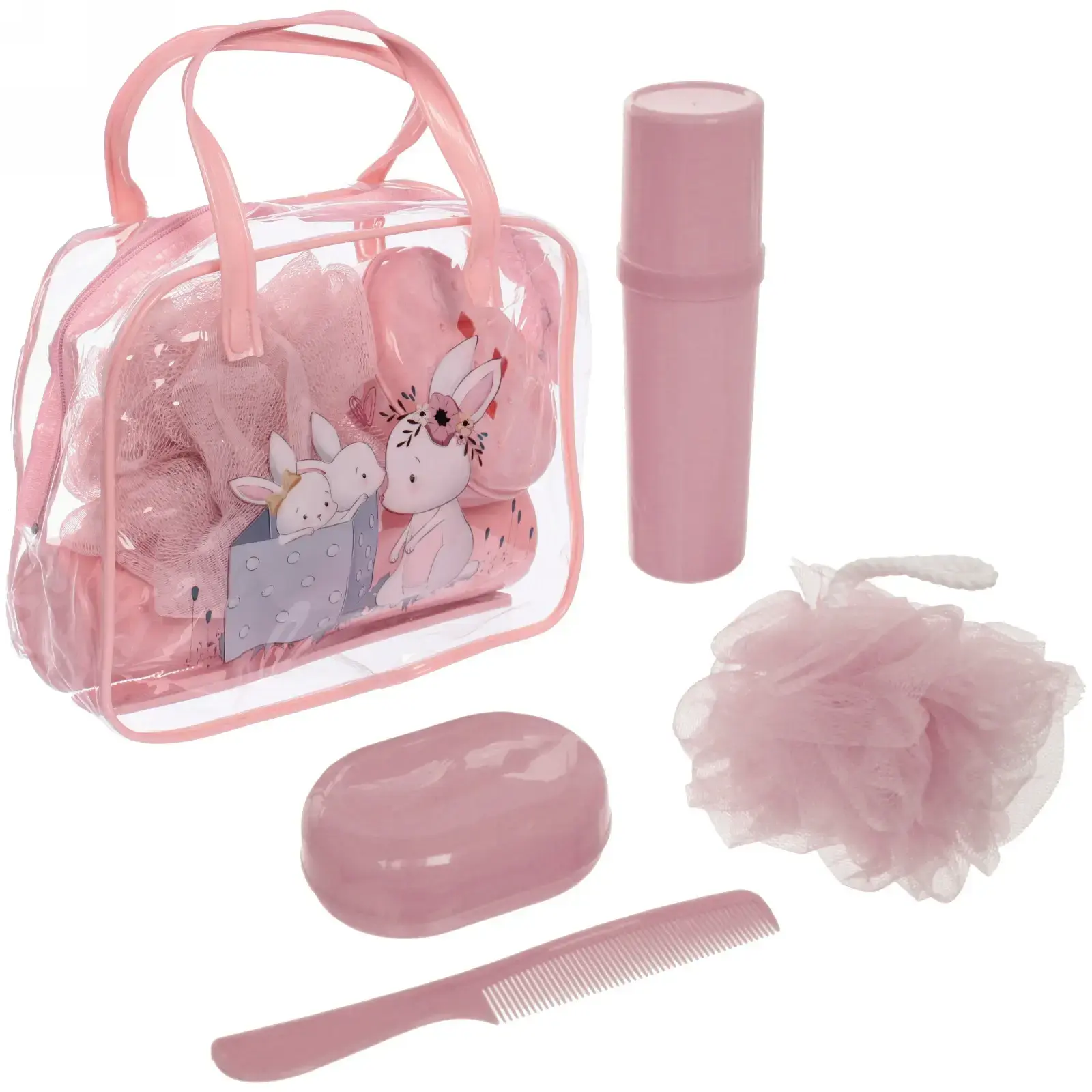 Яркие цветовые решения (розовый, голубой, прозрачный) и тематические рисунки с зайцами добавят позитива в ежедневные ритуалы ухода. Все предметы легко моются теплой водой с мылом и сохраняют первоначальный вид при регулярном использовании.