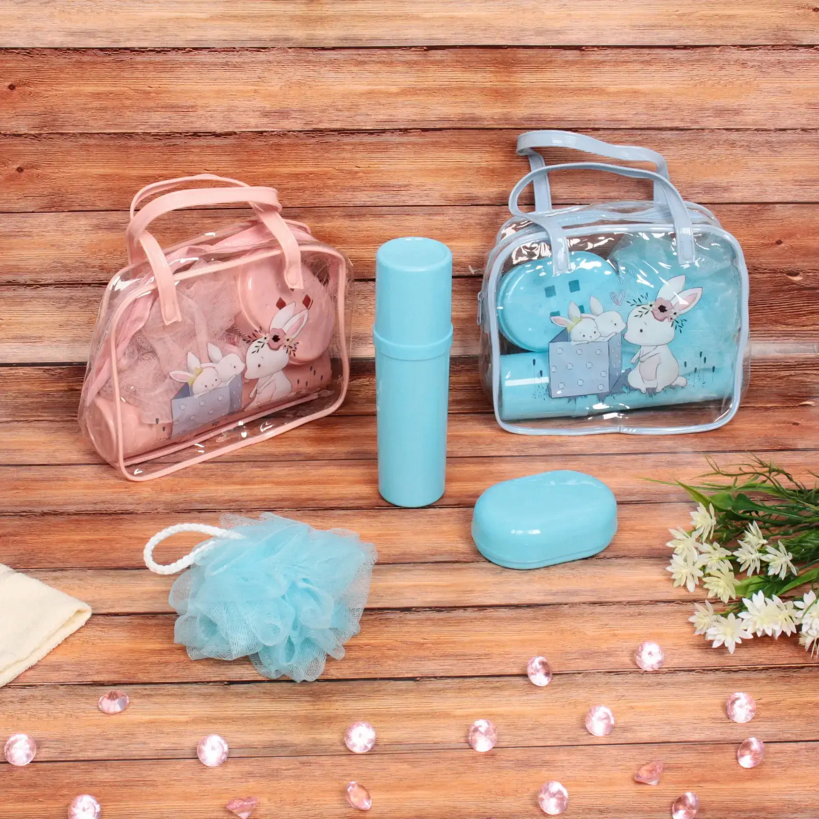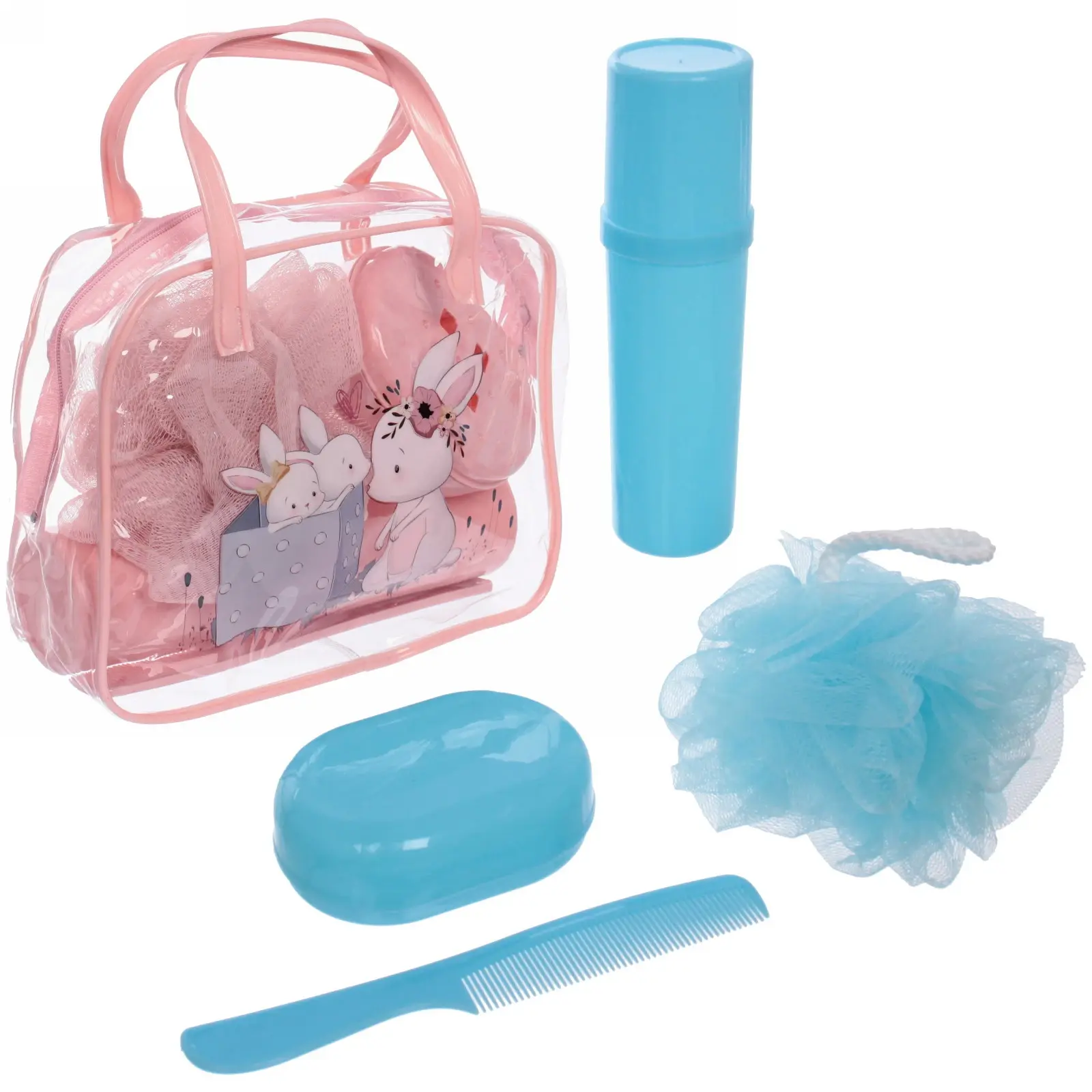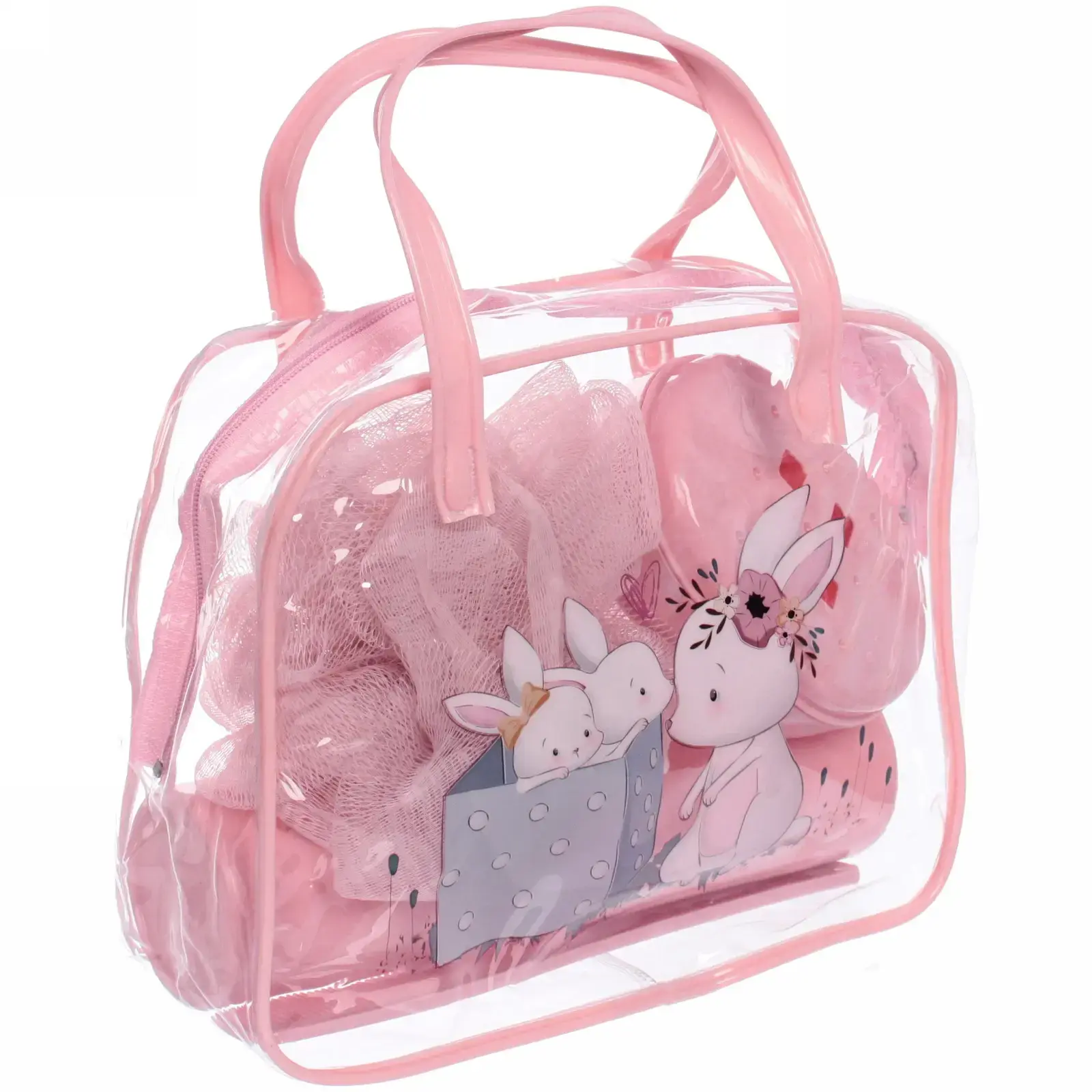 Яркие цветовые решения (розовый, голубой, прозрачный) и тематические рисунки с зайцами добавят позитива в ежедневные ритуалы ухода. Все предметы легко моются теплой водой с мылом и сохраняют первоначальный вид при регулярном использовании.