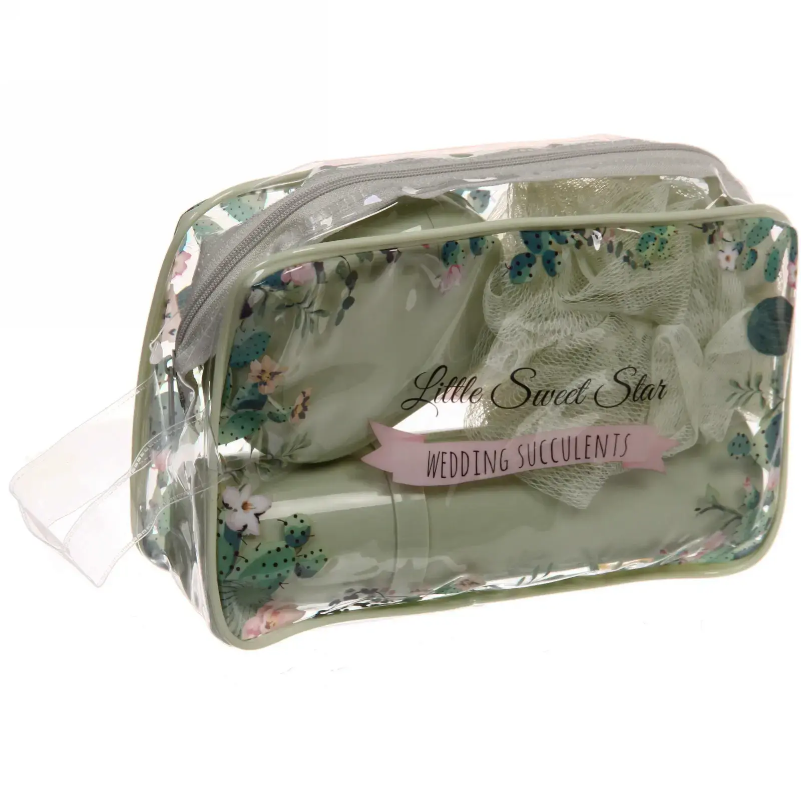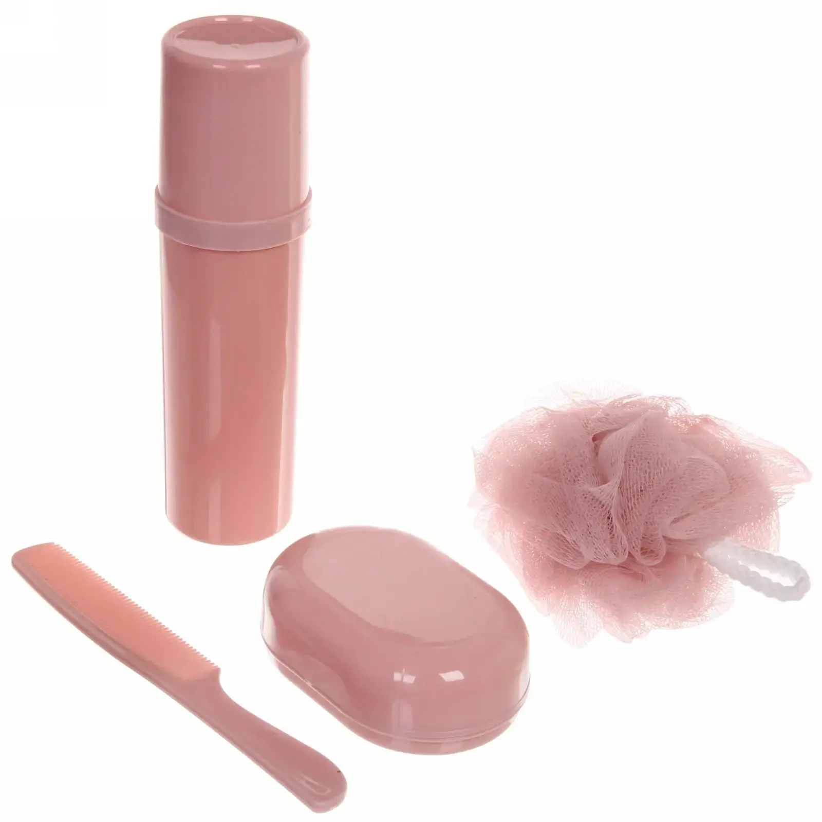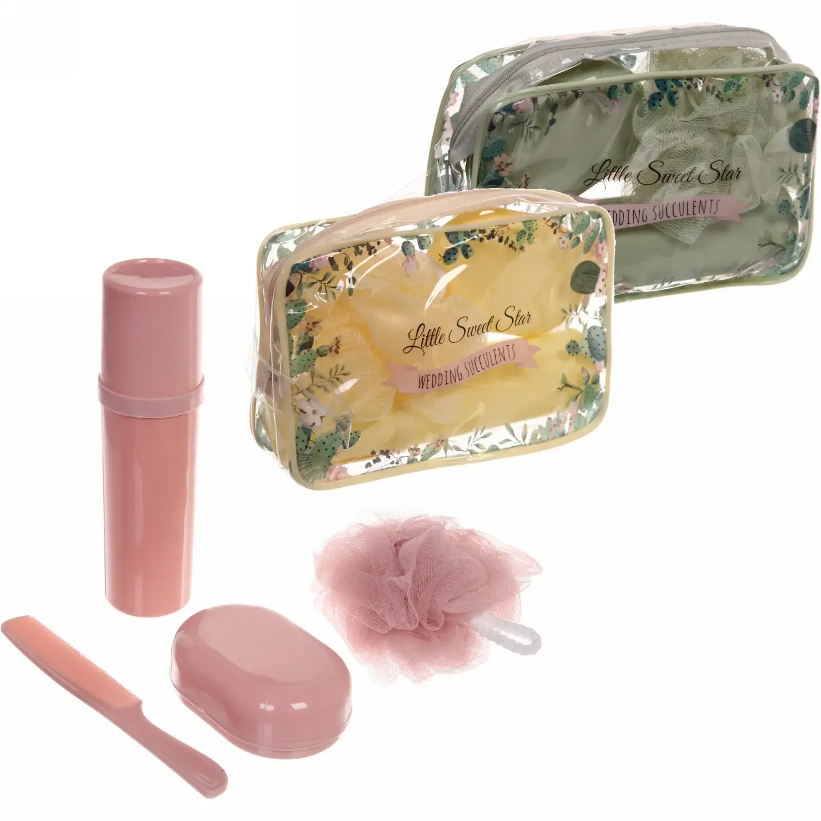 В состав набора входят мочалка-сетка, футляр для зубной щётки и пасты, закрытая мыльница, классическая расчёска и прозрачная косметичка с оригинальным дизайном. Все предметы выполнены из лёгкого и безопасного пластика, что обеспечивает их долговечность и практичность. Косметичка достаточно вместительная, чтобы уместить дополнительные принадлежности, такие как косметика и средства для ухода за телом.